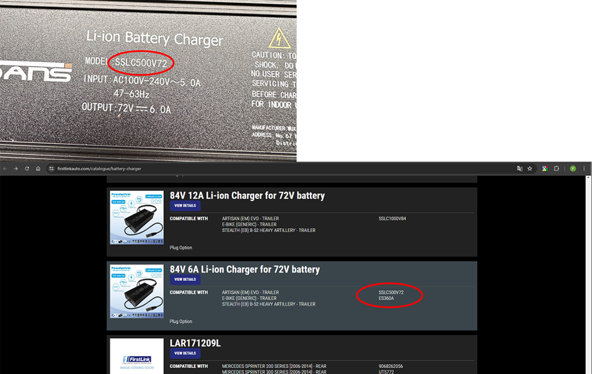 Da Du ein Foto der Bezeichnung Deines Ladegeräts, das Du zuhause verwendest, gepostet hast, lässt sich über diesen Umweg jedoch schon auch eine Aussage treffen. Die Bezeichnung "72V" ist hier jedoch auch etwas irreführend, da Ladegeräte normalerweise nicht mit der Nennspannung, sondern mit der maximalen Ladespannung ausgewiesen werden. Ich begab mich also nochmal kurz ins Internet und suchte nach der Modell-Nr Deines Ladegeräts, weil ich auf Deinem Ladegerät eine Bezeichnung "84V" erwartet hätte. Wie Du im Bild unten sehen kannst, wurde meine Vermutung bestätigt: