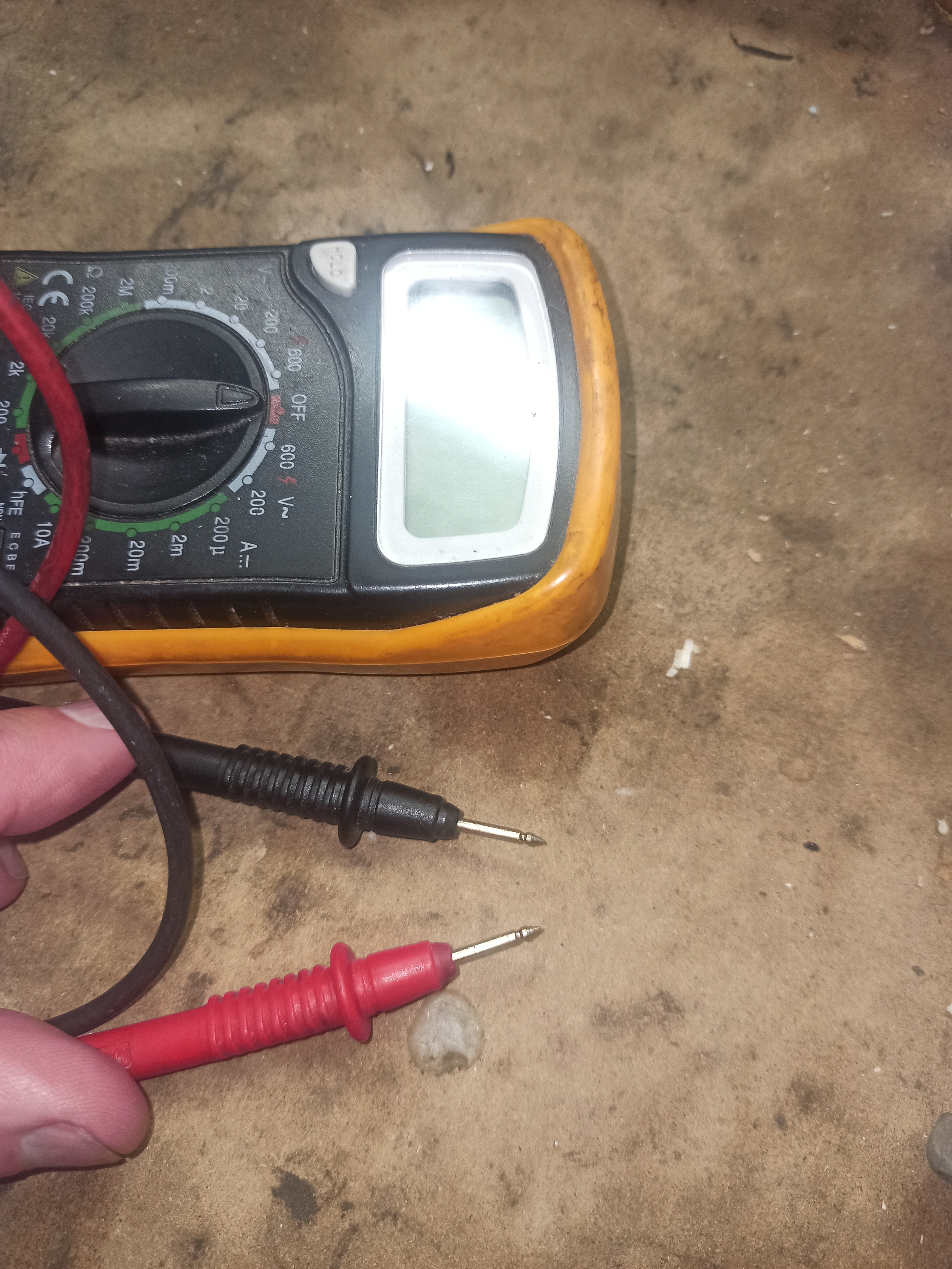 Zum Messen verwende den 2V- oder 200mV-Bereich des Multimeters, das ergibt mehr Kommastellen). Sollten 12V anliegen, geht das Messgerät dadurch nicht kaputt, zeigt nur Überlast. Statt Pin 2 kannst Du auch den oberen (!) Dickstromkontakt verwenden (keine Angst, der untere + wird nur beim Einschalten aktiv) bzw. per Ohm-Messung von diesem Dickstrom zum Pin2 checken, ob Deine Messspitzen weit genug in die kleinen Löcher reichen (man sollte 0,x Ohm messen). Versuche dann alternativ eine Stecknadel für Pin14 oder ähnliches und miss wieder gegen den Hochstromkontakt.