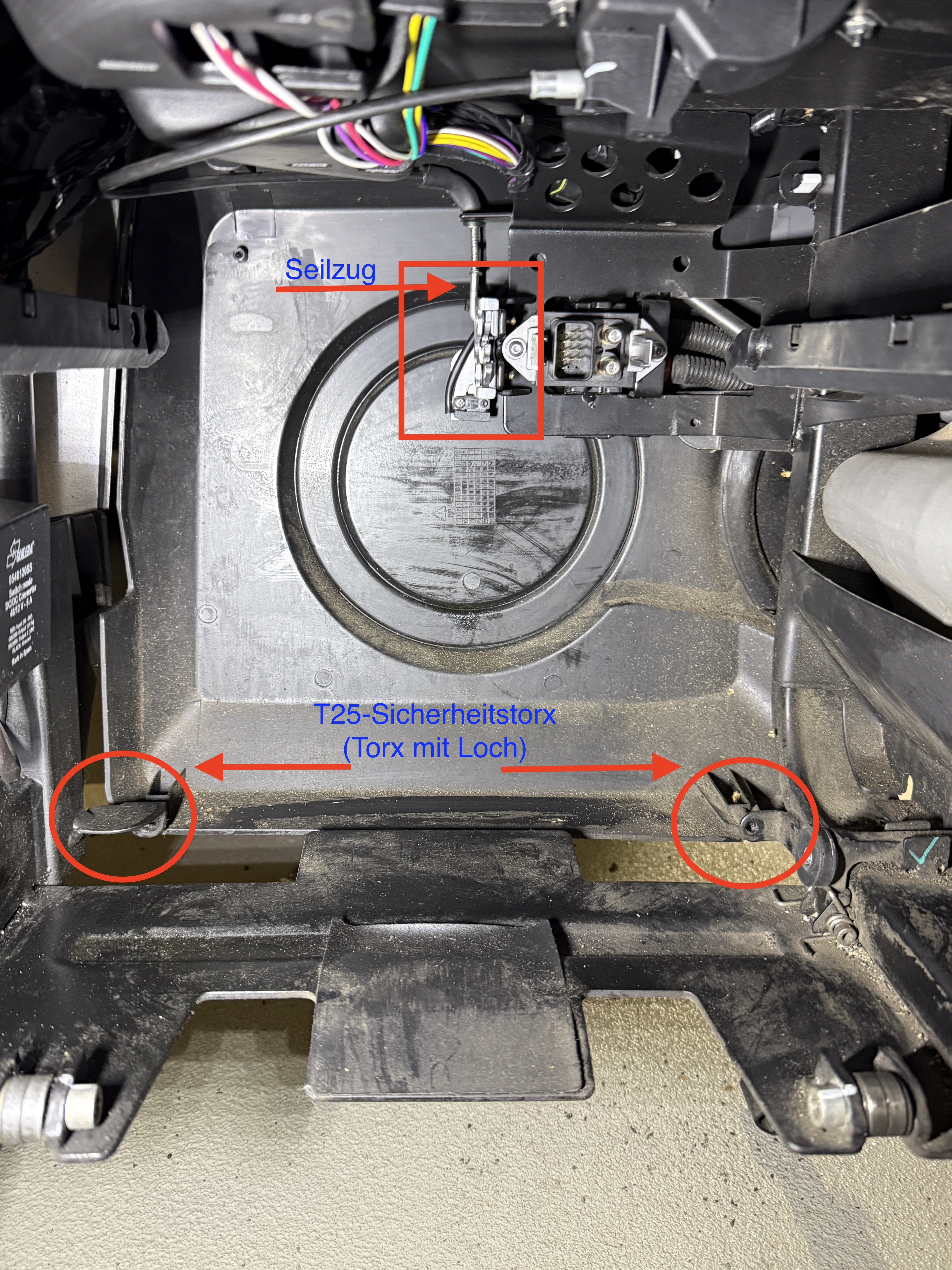 Aufgrund meiner heutigen Erfahrung kann ich nur jedem empfehlen, die Batterieverriegelung im Ablagefach unter dem Sitz nur mit wenig Kraft zu betätigen. Andernfalls besteht die Gefahr, dass der Seilzug aus seiner Halterung am Öffnungsmechanismus herausgezogen wird.