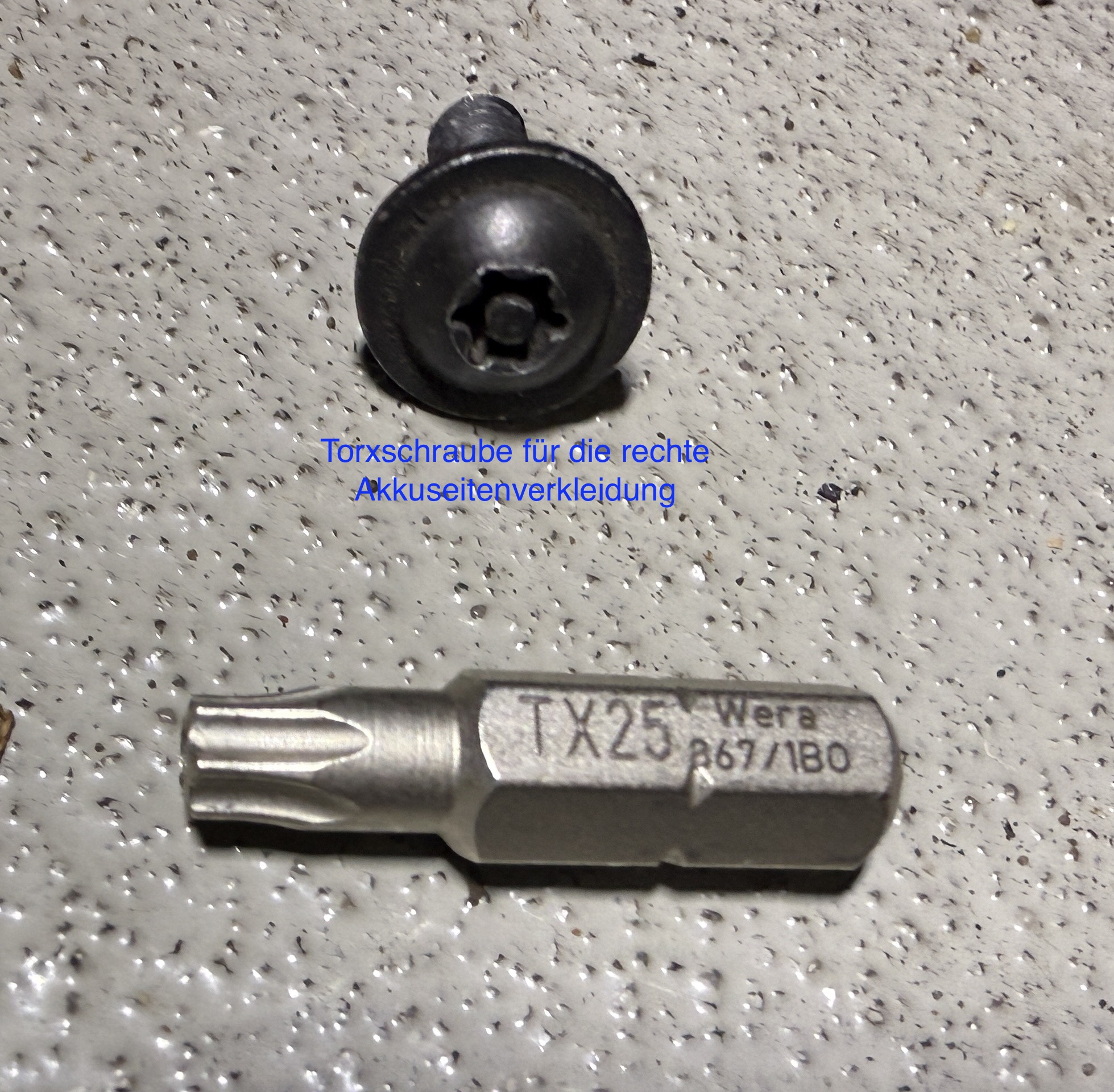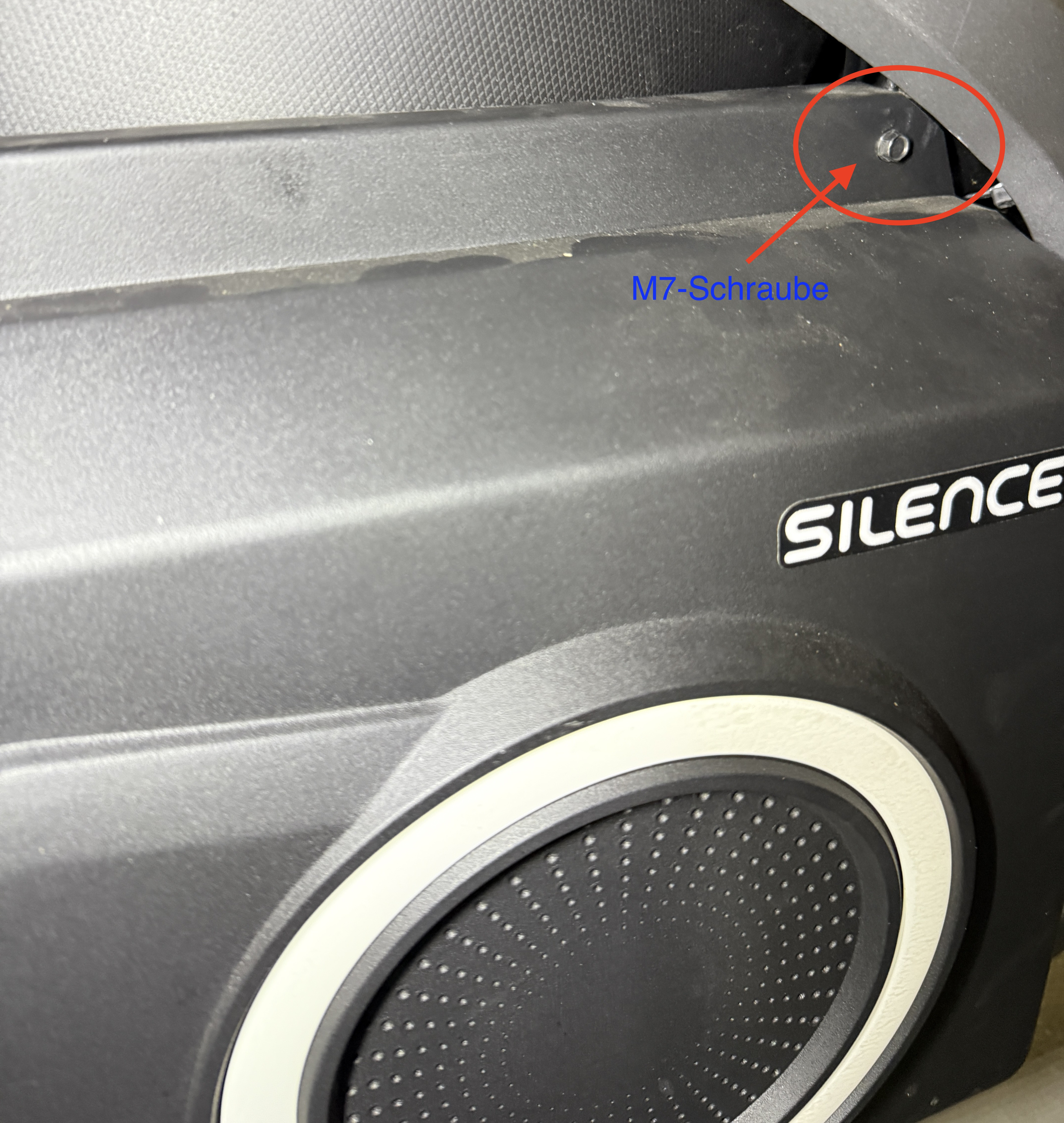 Ich habe einen Silence S01 Plus aus dem Jahr 2023 und musste feststellen, dass die rechte Seitenverkleidung des Akkus mit drei Schrauben gesichert ist. Eine M7-Schraube ist gut erreichbar, die beiden anderen sind Schrauben mit T25-Sicherheitstorx (Torx mit Loch). Wie zuvor beschrieben, kann man die beiden Torxschrauben bei eingeschobenem Akku nur mit einer kleinen Ratsche erreichen (siehe Foto).