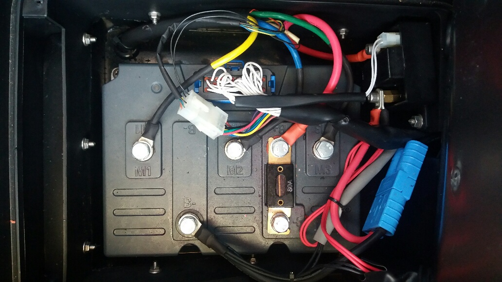 Die kleine Platine ist ein Interface (Kabelsortierstecker). Der Sevcon Controller sitzt unter der Zwischenplatte unterm Sitz. Sendet die LED auf dem Sevcon einen Blinkcode?