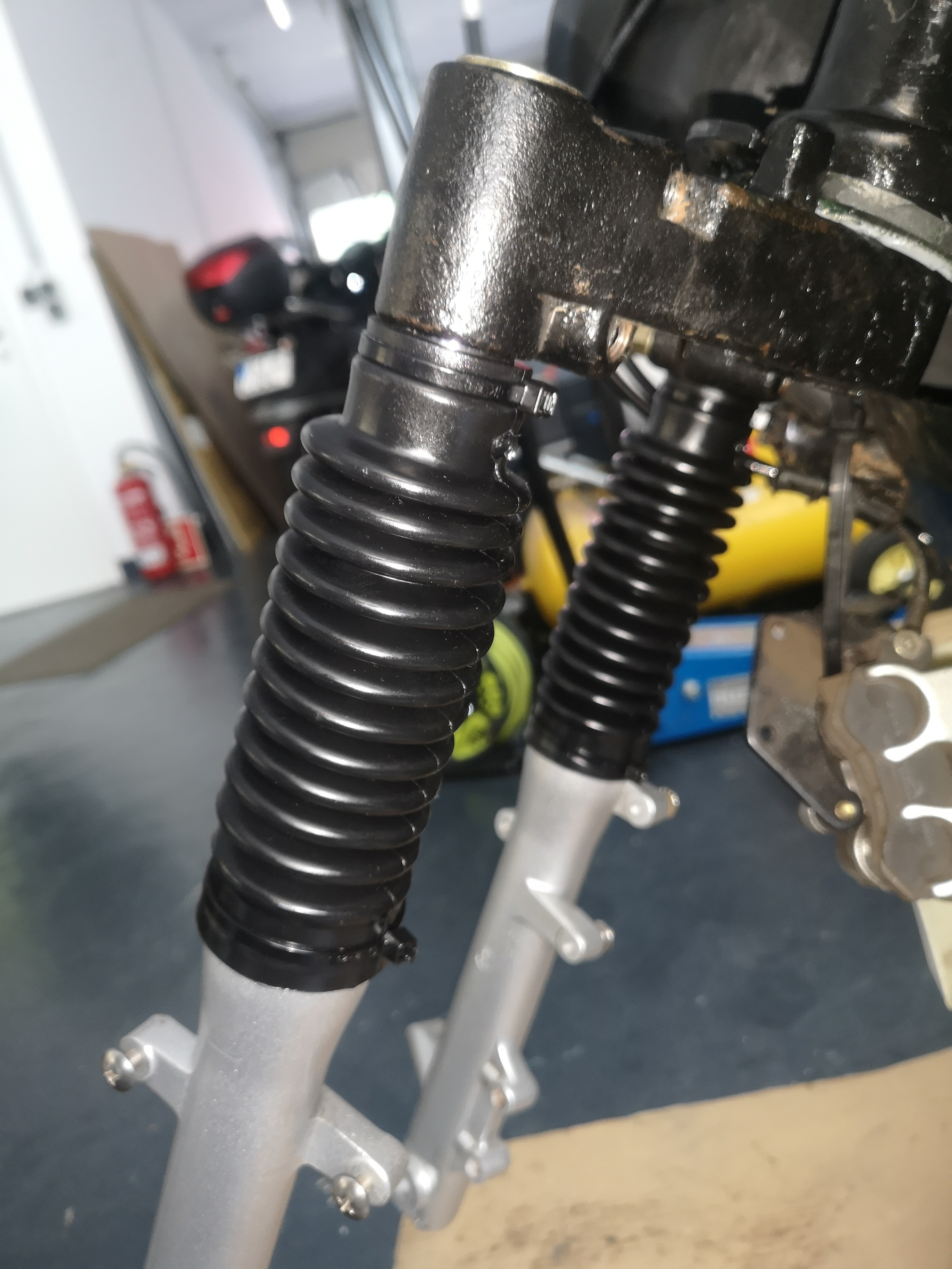 Ich bin ein Riesenfan von Faltenbälgen. Schon mein erstes Motorrad, eine 250er MZ, hatte welche (und einen Gummikanal für die Kette – war auch klasse). Dann bin ich lange Enduro gefahren. Auch unter den erschwerten Bedingungen sind mir dank Faltenbälgen nie die Simmeringe kaputt gegangen.