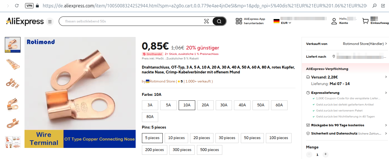 Ist dieser messingfarbene Kabelschuh aus China grundsätzlich geeignet, um die nötigen Stromströme auszuhalten? Da sieht man "10 A" eingeprägt. 10 Ampere bei wieviel Volt überhaupt?