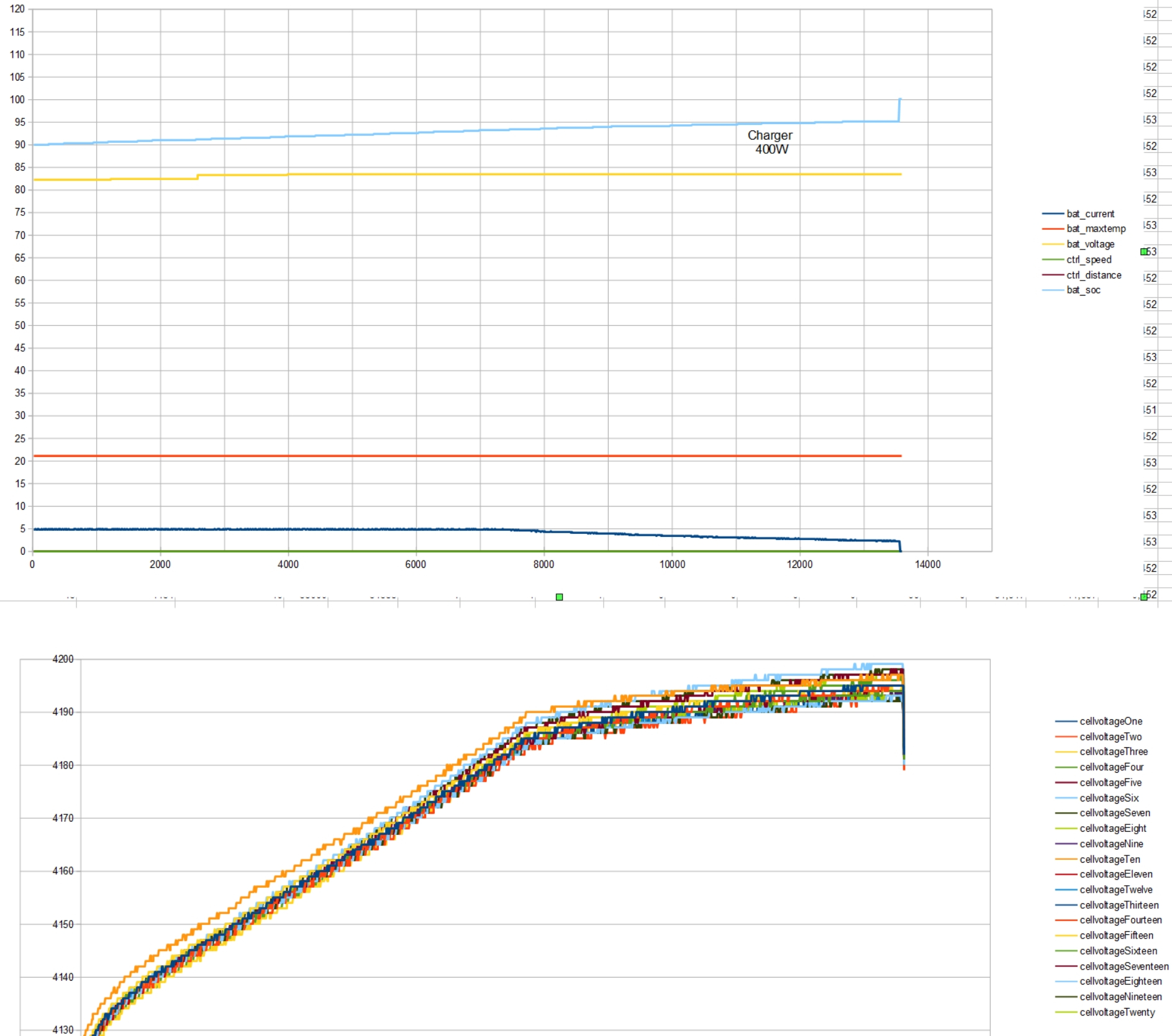 Ich habe mal noch die worst case Kurve vom problematischen 400W Ladegerät gefunden, welches ich mittlerweile nicht mehr verwende. Hier hat es die CV-Phase erst gar nicht erreicht und der SOC-Wert wurde recht stark einfach hochkorrigiert. Das habe ich dann bei der geringen Reichweite auch gespürt.