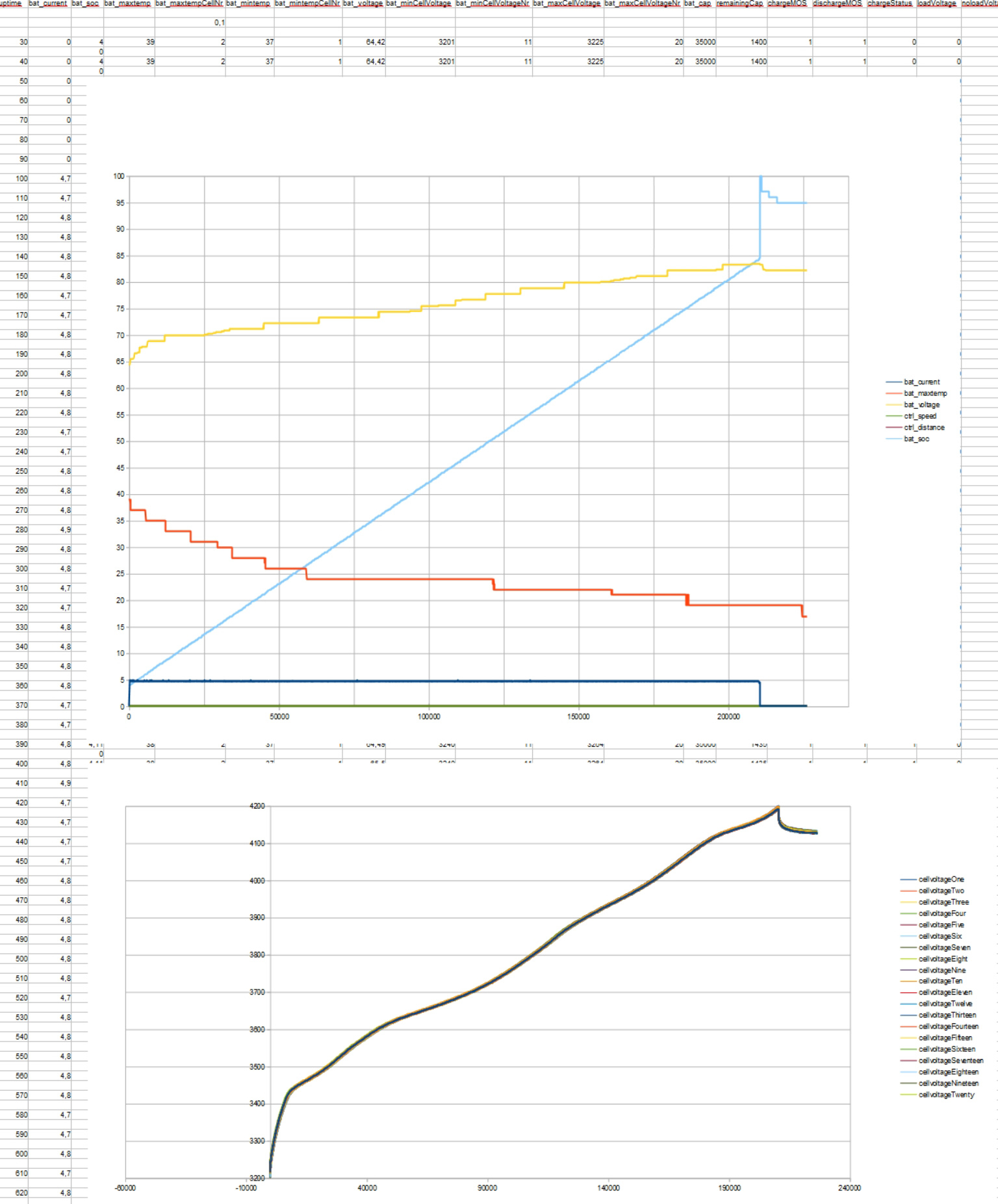 Nun dieser Kurve entnehme ich, dass die Zellen nahe an 4,2 Volt herangebracht worden sind und bei überschreiten der im BMS hinterlegten Spannungsschwelle dies seine SOC-Schätzung von rund 95% auf 100% korrigiert hat (Sprung nach oben). Beim Unterschreiten der Stromschwelle des Ladegerätes (2,4 Ampere) oder alternativ bei erstem Zellenstrang oberhalb von 4,2 Volt (wenn die Anzeige so grob ist) wurde dann das Laden beendet (unklar ob vom Ladegerät oder vom BMS). Nachdem kein Ladestrom mehr floss, gingen die Spannungen der Zellenstränge dann auf 4,18 Volt zurück. Das sieht doch eigentlich ganz normal aus. Üblich wäre auch, dass es am nächsten Tag nur noch 4,16 Volt sind.