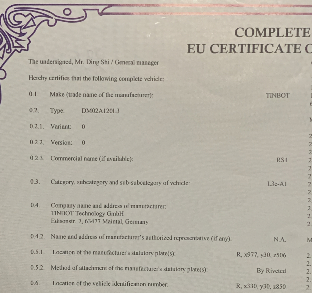 Mag also sein, dass die Fahzeuge seit letztem Herbst nicht mehr COC-Papiere als TINBOT erhalten, sondern jetzt ein anderer Hersteller die Dokumente herausgibt. Dass die TINBOTS zu 100% aus europäischer Produktion stammen, ist wohl eher nicht anzunehmen.