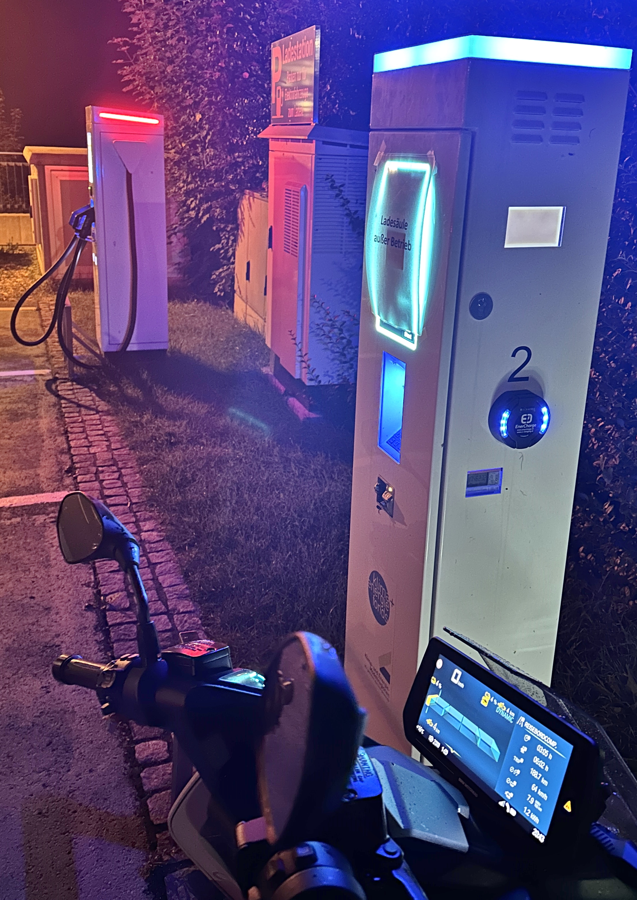 Habe mich am ersten Tag beim Abholen (240km Strecke) mit meiner CE04 im strömenden Regen verfahren und dadurch waren es zur Ladestation nicht 4km wie geplant um mit 2% anzukommen, sondern 10km. Dachte mir: Nützt ja nix, muss ich halt schieben. Bin dann die letzten 4 km mit 0% gefahren, am Fahrradstreifen neben der Fahrbahn mit 20-30 km/h.