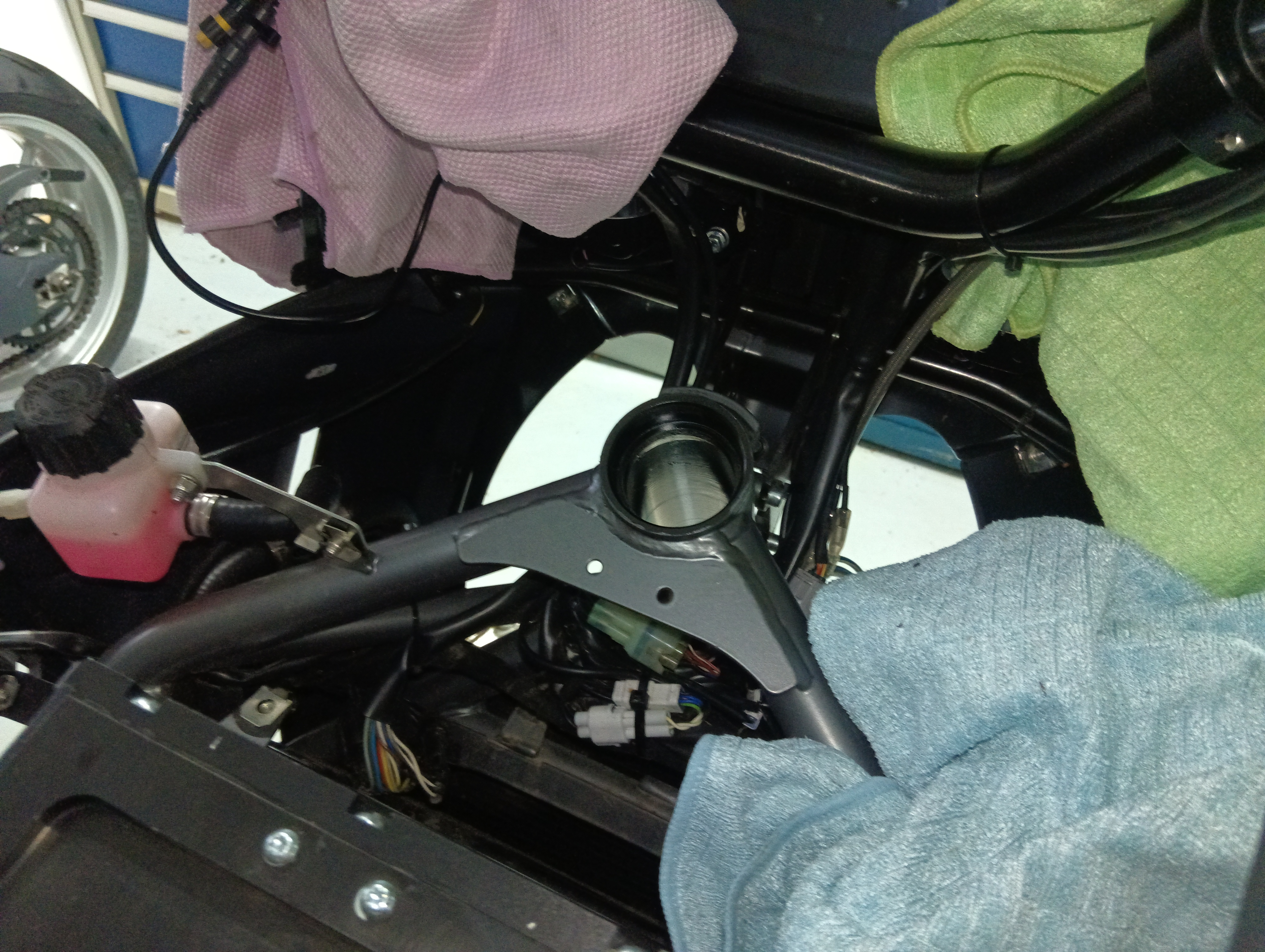 mittlerweile steht die Energica wieder auf der Bühne, diesmal ist das Lenkkopflager dran. Ausgebaut ist es schon, das untere Lager war nach 9000 km vollkommen verrostet. An den Lagern war kaum Fett.