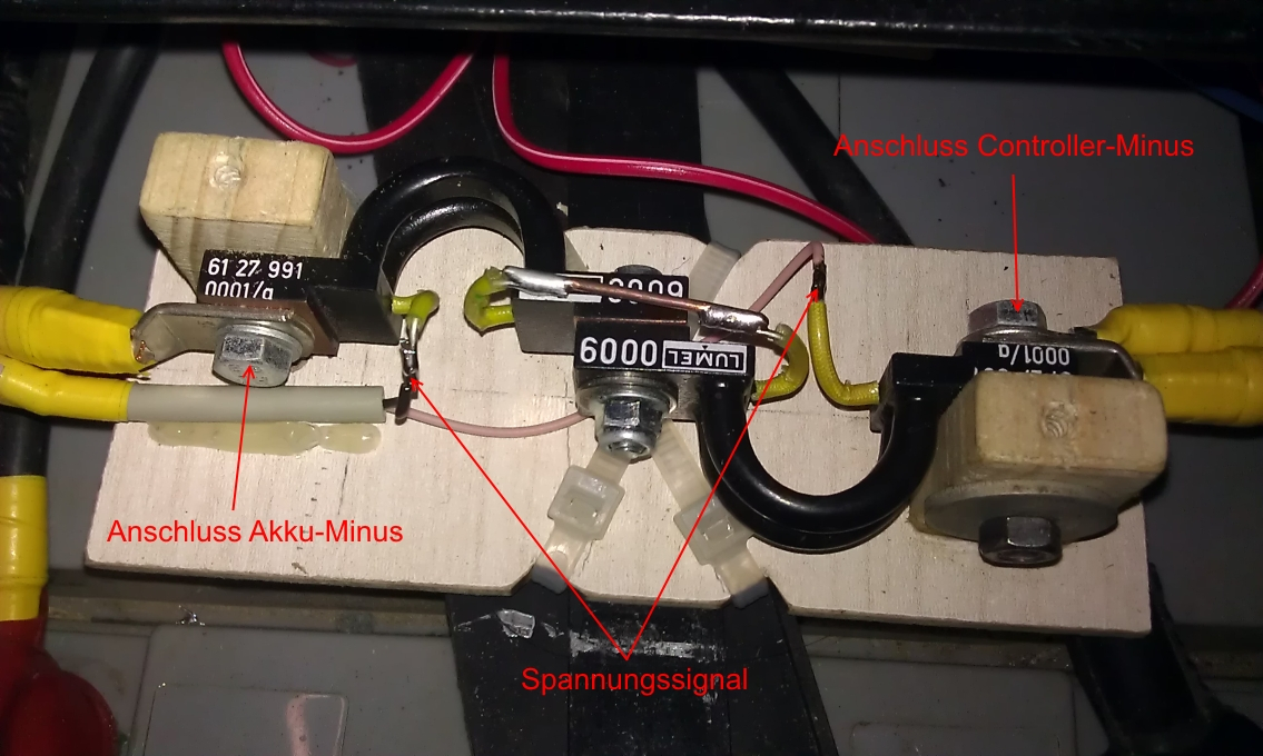 D.h. zwei Schraubanschlüsse für das Batterie-Minuskabel und zwei lötfahnen für das Spannungssignal. Um auf das erforderliche Spannungs/Stromverhältnis zukommen, müssen wie gesagt zwei Shunts in Reihe geschalten werden, dabei zwei Schraubanschlüsse verbinden und die dazugehörigen Lötfahnen verbinden.