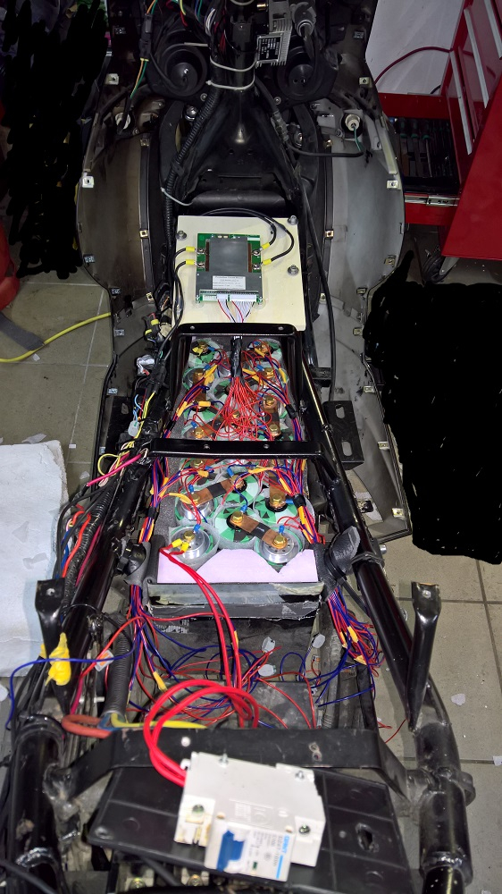 So nun sind sie drin, habe die Zellen von allen Seiten mit Verbundschaumstoff verkleidet. Die Zellen haben einen 900 Gramm Kern und der sollte so ruhig wie möglich gelagert sein dachte ich mir. Vom Gewicht her habe ich jetzt so ungefähr 25kg eingespart, da bin ich morgen mal bei der ersten Fahrt gespannt wie sich das bemerkbar macht. Ist vorerst ein ganz schönes Kabelwirrwarr, aber ich habe jede Zelle zusätzlich einzeln verkabelt. Damit ich sie später mal vom Sicherungsfach aus einzeln von Zeit zu Zeit balancieren kann. Werde nach der ersten Fahrt auch ganz genau den Ladestrom messen und mit den gefahrenen Kilometern notieren. Kann dann später denke ich genau analysieren wie der Zustand des Akkupacks ist.