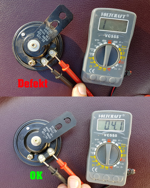 Wenn man keine 4 - 8 Ohm Widerstand misst, heißt das nicht automatisch die Hupe ist kaputt.