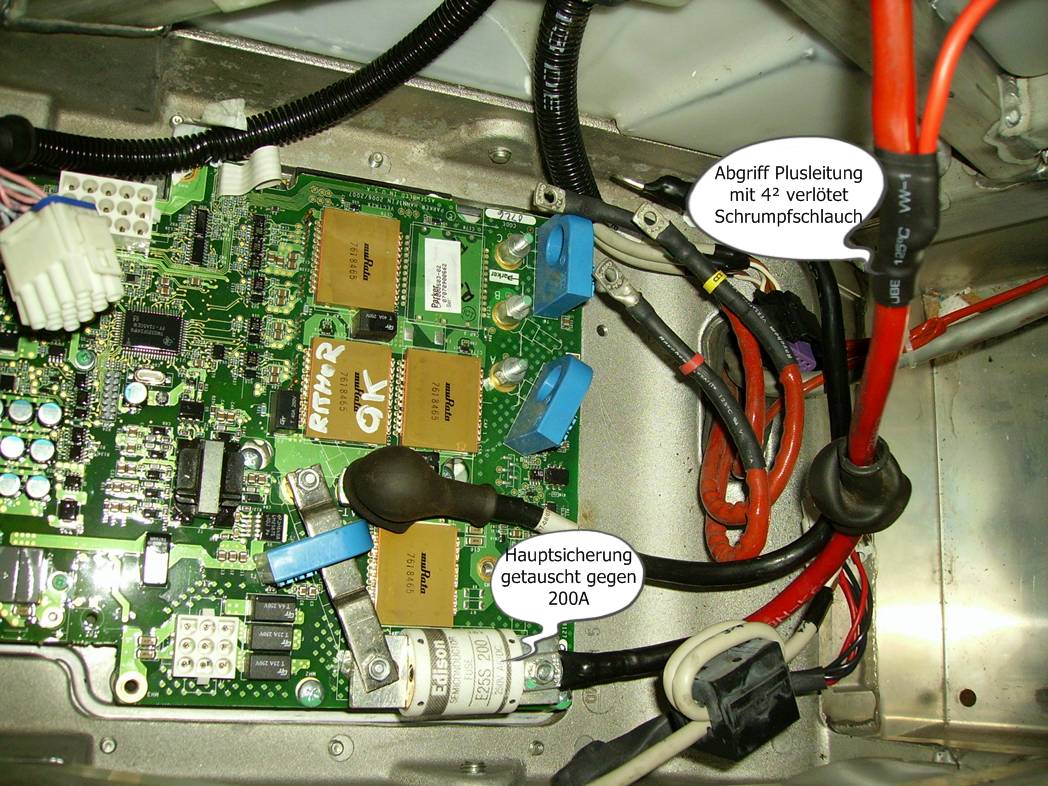 die 200A Sicherung kam bei mir an und die alte Sicherung mit 125 A wurde von mir ausgetauscht. Zum Herankommen an die Sicherung muss der gelochte Controllerdeckel abgenommen werden. Dazu baut man aber besser den hinteren Akkublock zunächst aus. bei mir war er ja schon ausgebaut. Ich habe dazu zunächt die zwei oberen Zellreihen herausgenommen, dann wird der Block schonmal leichter zu heben und dann kann der Rest vom Block (ca. 25-30 kg) herausgehoben werden.