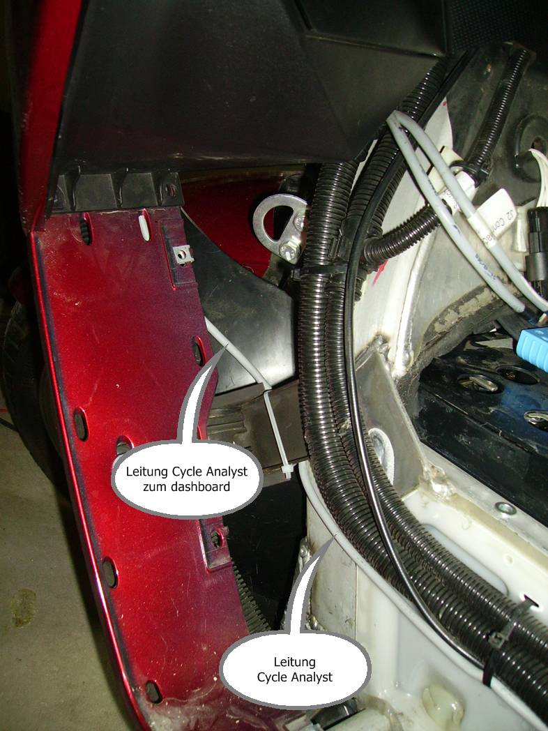 Der Roller ist jetzt vollständig für den C.A. und den Batterie-Lade-/Entladeanschluß im Helmfach verkabelt. Im Moment mache ich schon eine Ausgleichsladung über Nacht mit meinem Mini-Ladegerät mit 0,1A .Ich sollte die Ladung aber besser Ergänzungsladung nennen, es fehlt nämlich zunächst mal noch was. Die defekte Akkuzelle hatte ich ja schon ausgetauscht. Erste Probefahrt (35km) habe ich heute positiv abgeschlossen.
