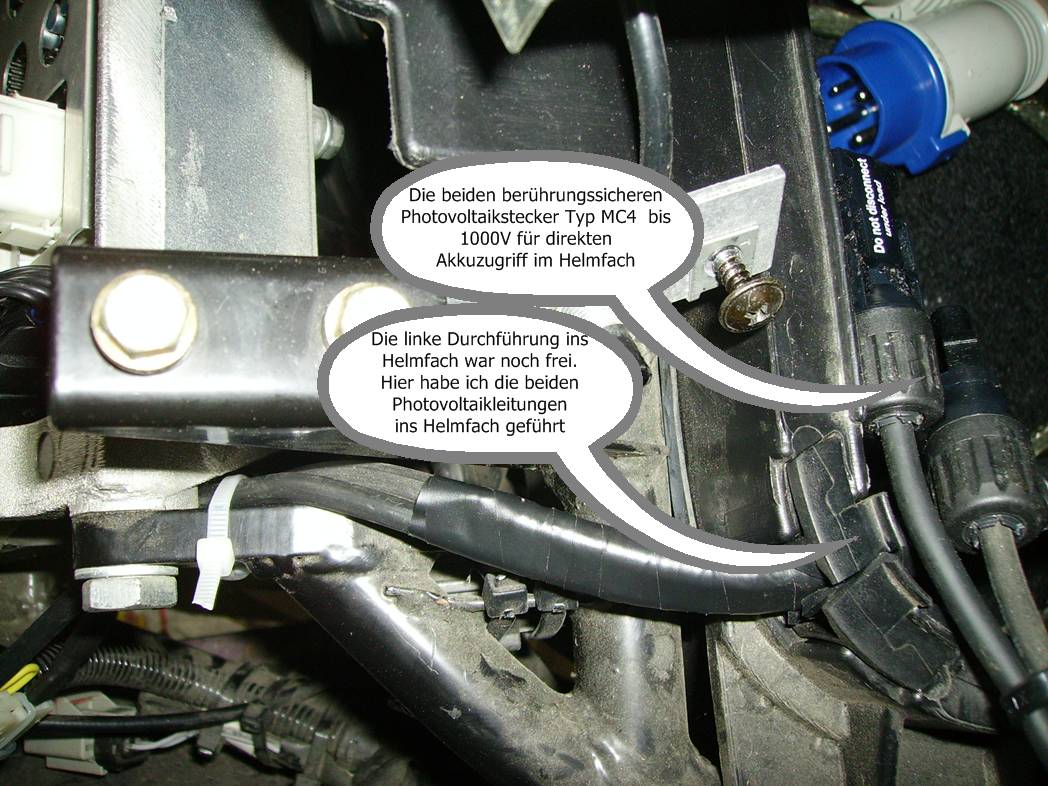 Der Roller ist jetzt vollständig für den C.A. und den Batterie-Lade-/Entladeanschluß im Helmfach verkabelt. Im Moment mache ich schon eine Ausgleichsladung über Nacht mit meinem Mini-Ladegerät mit 0,1A .Ich sollte die Ladung aber besser Ergänzungsladung nennen, es fehlt nämlich zunächst mal noch was. Die defekte Akkuzelle hatte ich ja schon ausgetauscht. Erste Probefahrt (35km) habe ich heute positiv abgeschlossen.
