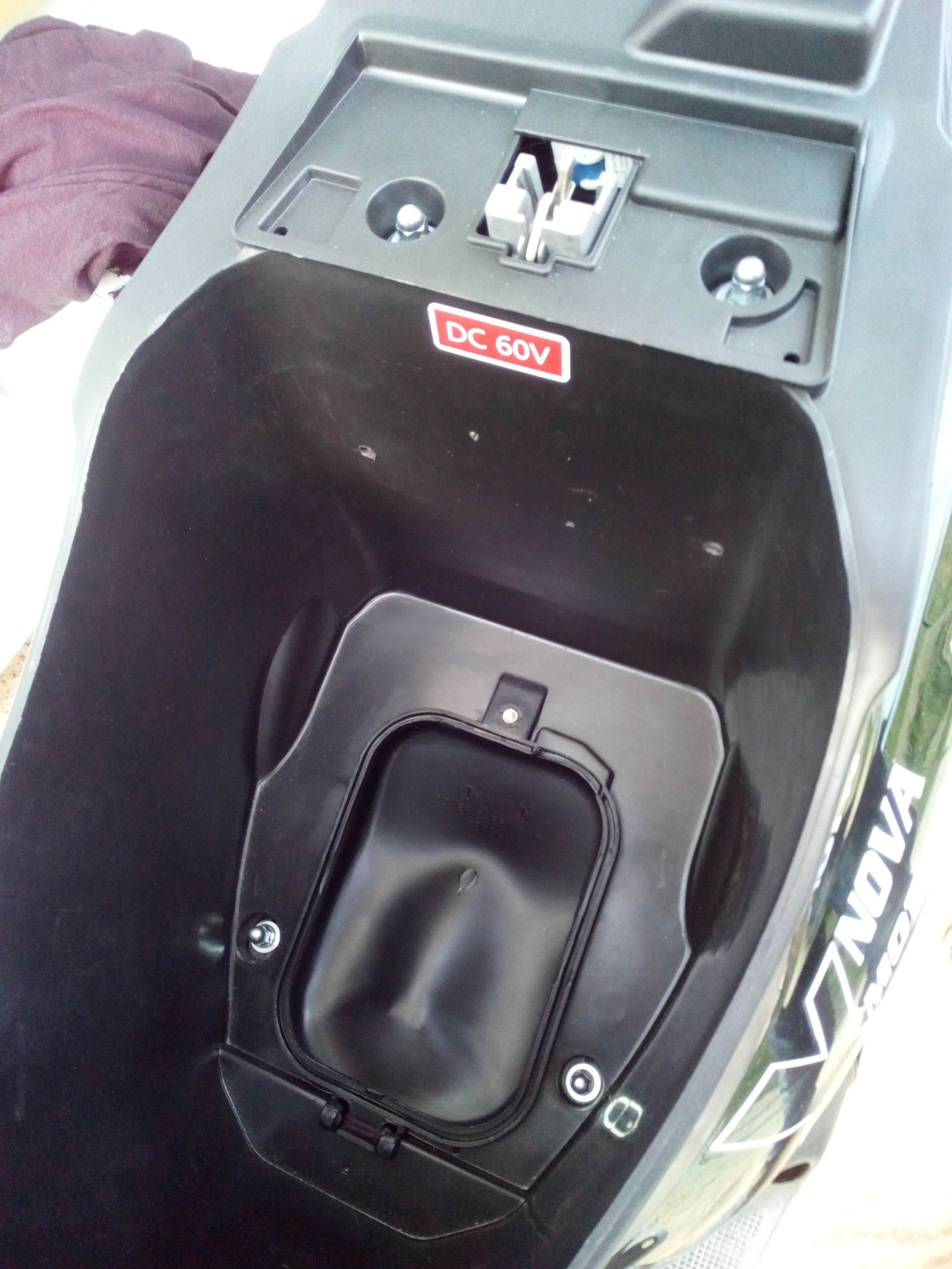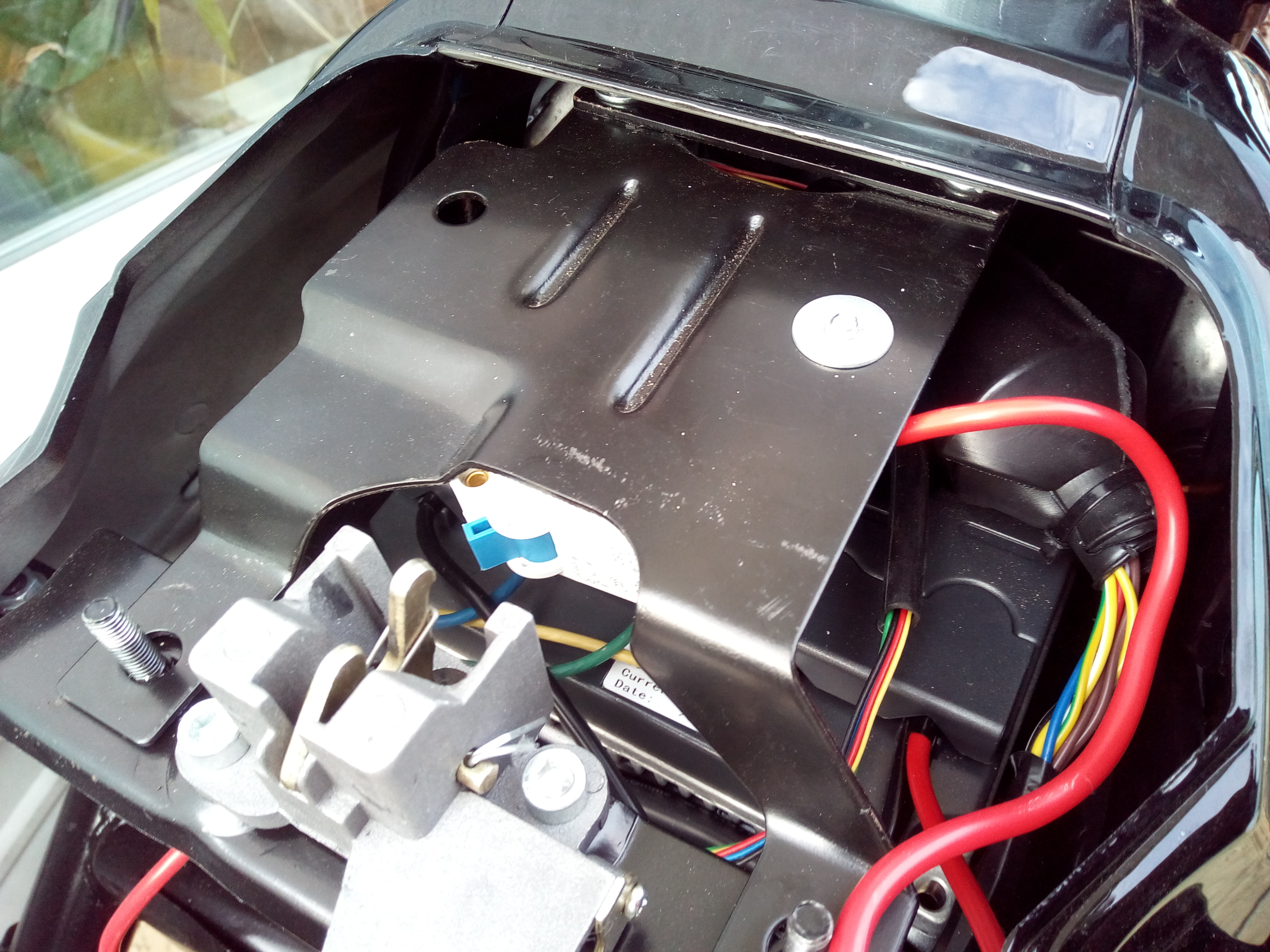 Jedenfalls bin ich nun gleich mal das Helmfach angegangen. Konkret habe ich diesen Sicherungsautomaten anders eingebaut und die Bodenluke mit der Wölbung nach unten festgemacht, wie es bereits im anderen Thread beschrieben wurde. Sie wird jetzt ein wenig von dem Batterieschutzbügel eingedrückt, was aber nicht weiter dramatisch ist.