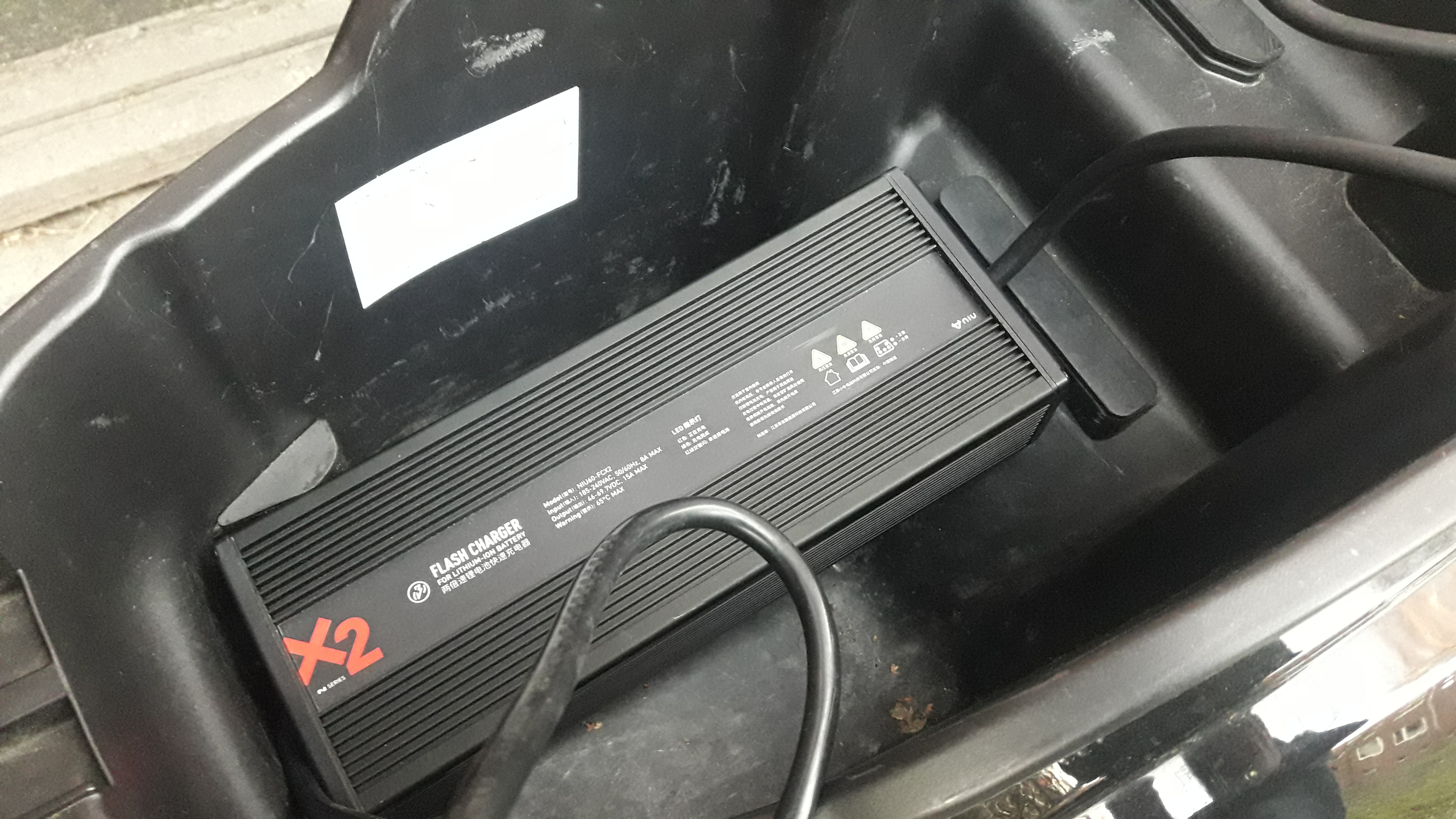 Wenn ich den NIU X2-Flash Charger an meine Super Soco TC Batterie anschließe, lädt er diese mit nur 5A auf. Er bleibt im Standard-Modus und wechselt nicht auf Schnell-Laden. Irgendwie scheint er auf eine Identifizierung der Batterie als N-GT oder N-Plus zu warten. Auch Kurzschließen der Datenpins untereinander hilft nicht.