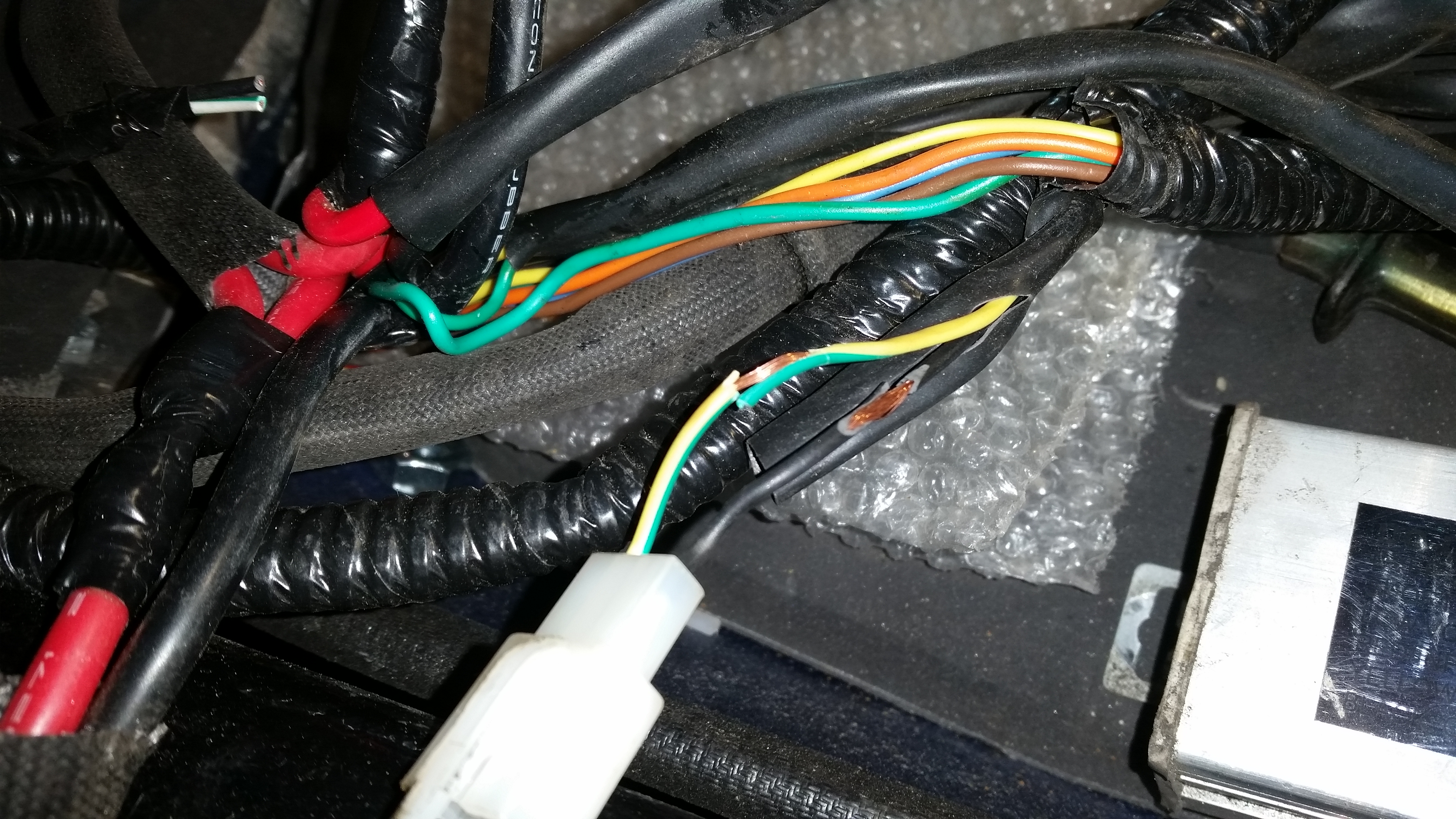 Warum ist an beiden Kabeln die Isolierung weg? Das ist eine gute Rezeptur für einen elektrischen Kurzschluss, auch wenn es nur das Seitenständerkabel ist.