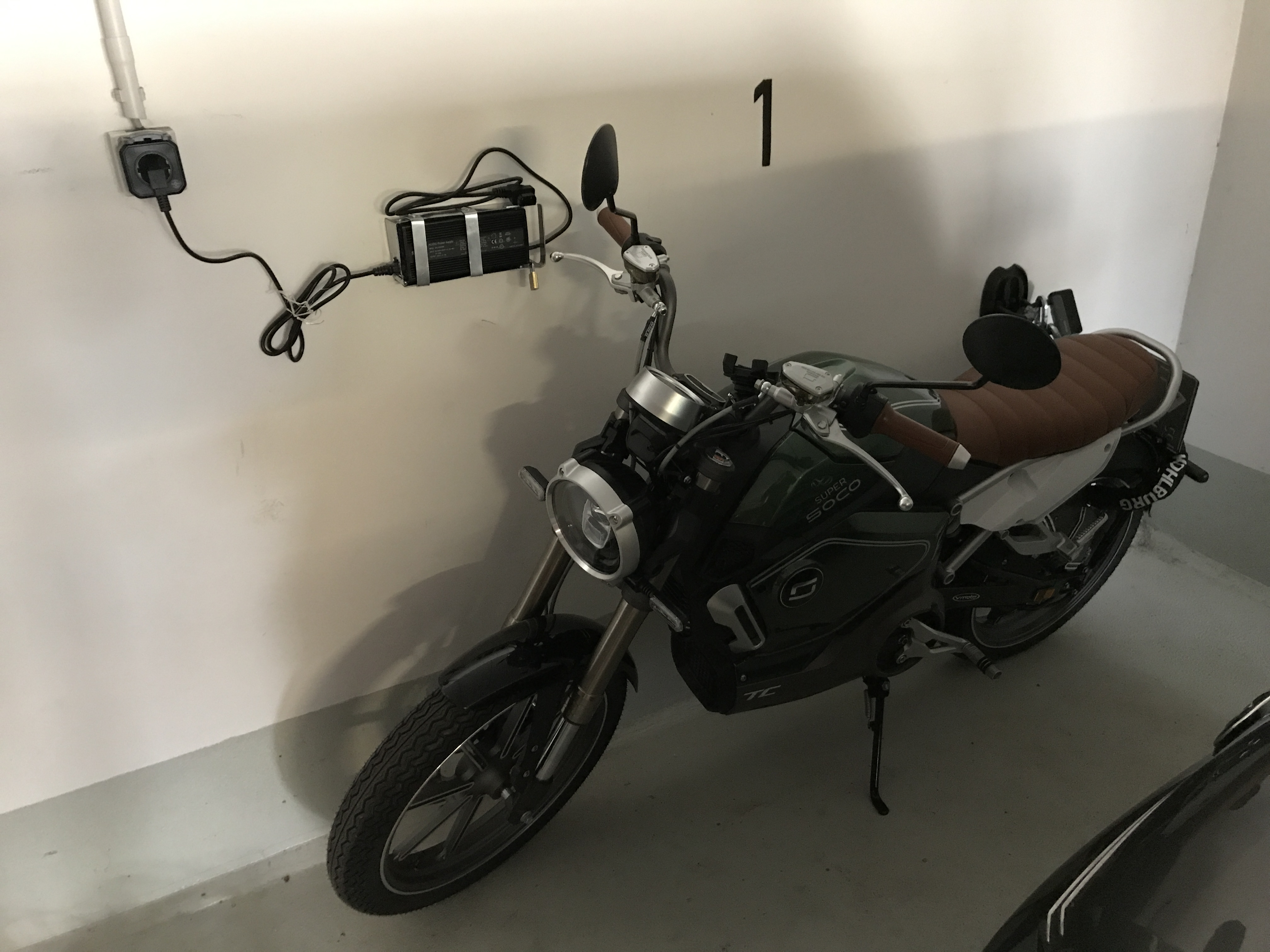 Nachts steht die Maschine in der Tiefgarage, nur mit der Alarmanlage gesichert. Wir sind ein Haus mit nur acht Parteien und alle kennen sich persönlich, da klaut keiner etwas. den Akku baue ich zum Laden aus und trage ihn in den Keller, weil in der Tiefgarage keine Steckdose ist. Klauen der super soco ohne Akku wäre ziemlich doof und finanziell auch nicht so rentabel. Tagsüber auf dem Parkplatz der Firma oder in der Stadt verwende ich zusätzlich zu Alarmanlage und Lenkerschloss ein Bremsscheiben-Schloss (das gelbe Hartmann von Louis).