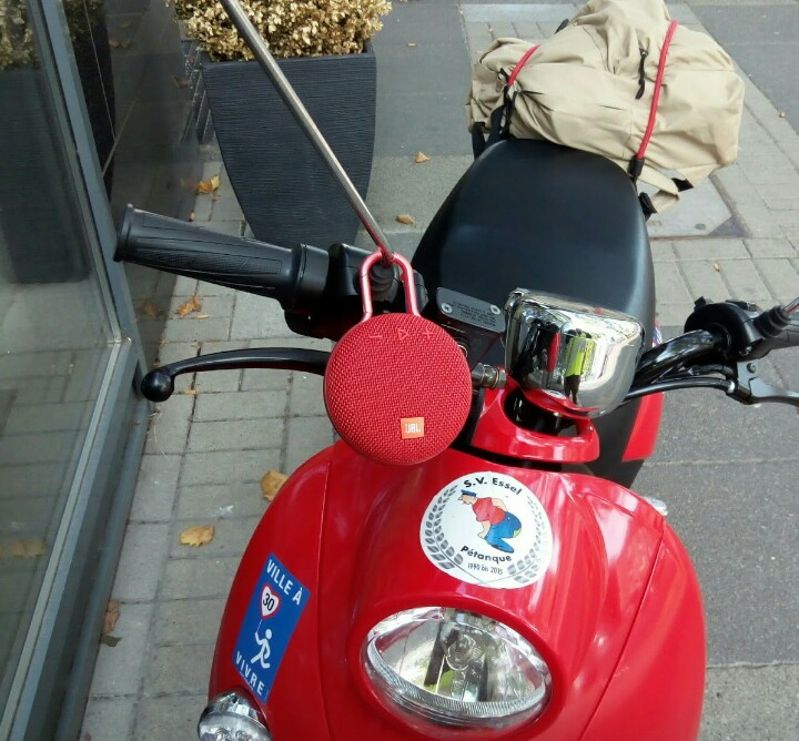Irgendwann fand ich den "Clip 3" von JBL. Den kann ich am Spiegel einhaken, er verträgt Regen, ich kann mit Handschuhen laut und leise regeln oder "Pause" machen. Muss halt per Bluetooth mit meinem Smartphone verbunden sein.