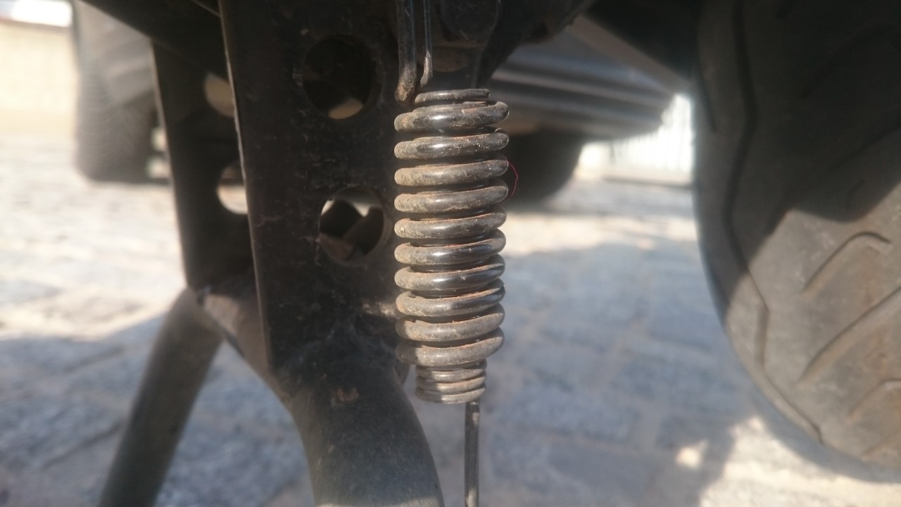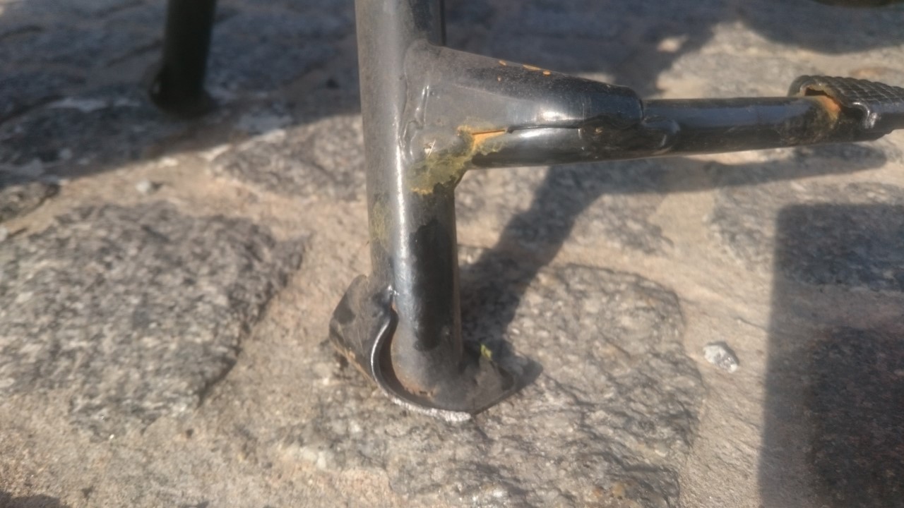 Die Abhilfe ist einfach, wenn man schweißen kann oder einen guten Schweißer kennt: Man muss auf den verformten Anschlag wieder ausreichend Schweißgut aufbringen, bis der Hauptständer wieder seine ursprünglich steile Lage einnimmt, wenn der Roller aufgebockt ist. Dann ist das Hinterrad wieder vom Boden weg, und der Fußhebel hat auch wieder Luft zum Boden und bricht NICHT ab. Ich rate, das SCHNELLSTMÖGLICH anzugehen, wenn Dir der Hauptständer etwas wert ist. Man muss das aufgebrachte Schweißgut sicher noch mit Flex oder Feile in Form bringen, um die Anschlagfläche zu maximieren, und danach sollte die Stelle gut grundiert und lackiert werden, um vor Rost zu schützen.