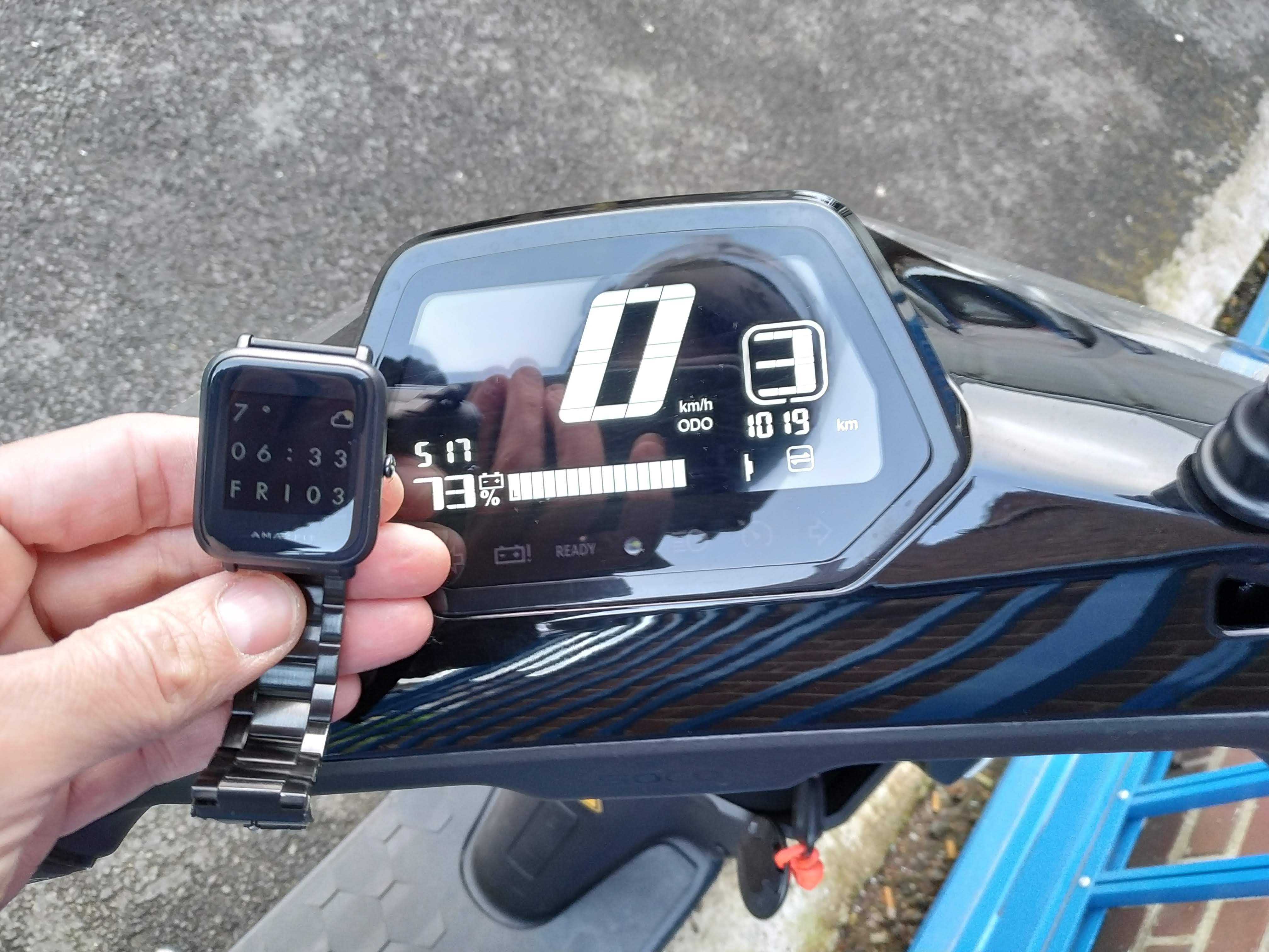 So sieht das übrigens nach meiner morgendlichen Pendelfahrt mit der Uhrzeit aus, nachdem sich die Uhr nach Einsetzen des Akkus und Einschalten mit einer Stunde Versatz gestellt hat. Die Uhr läuft dann nicht mehr korrekt mit und steht dann während der Fahrt.