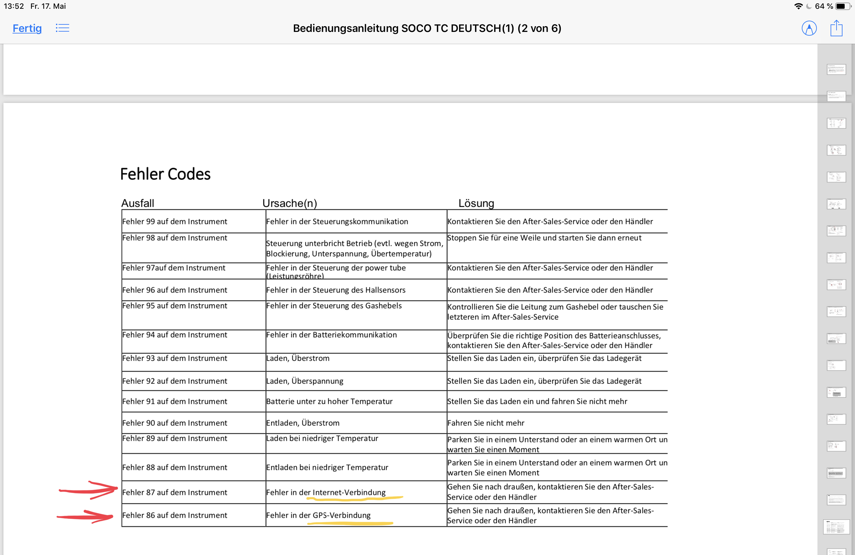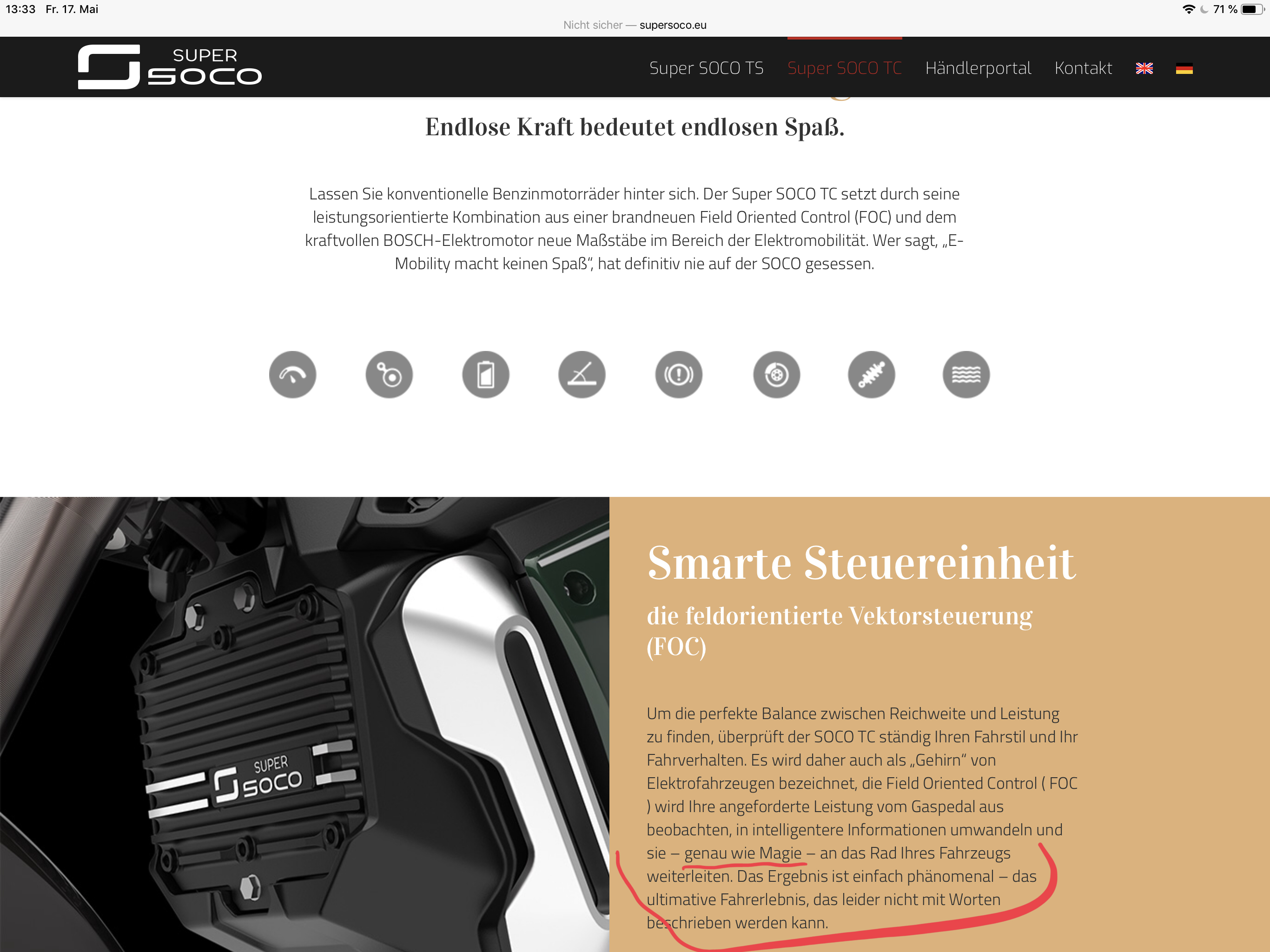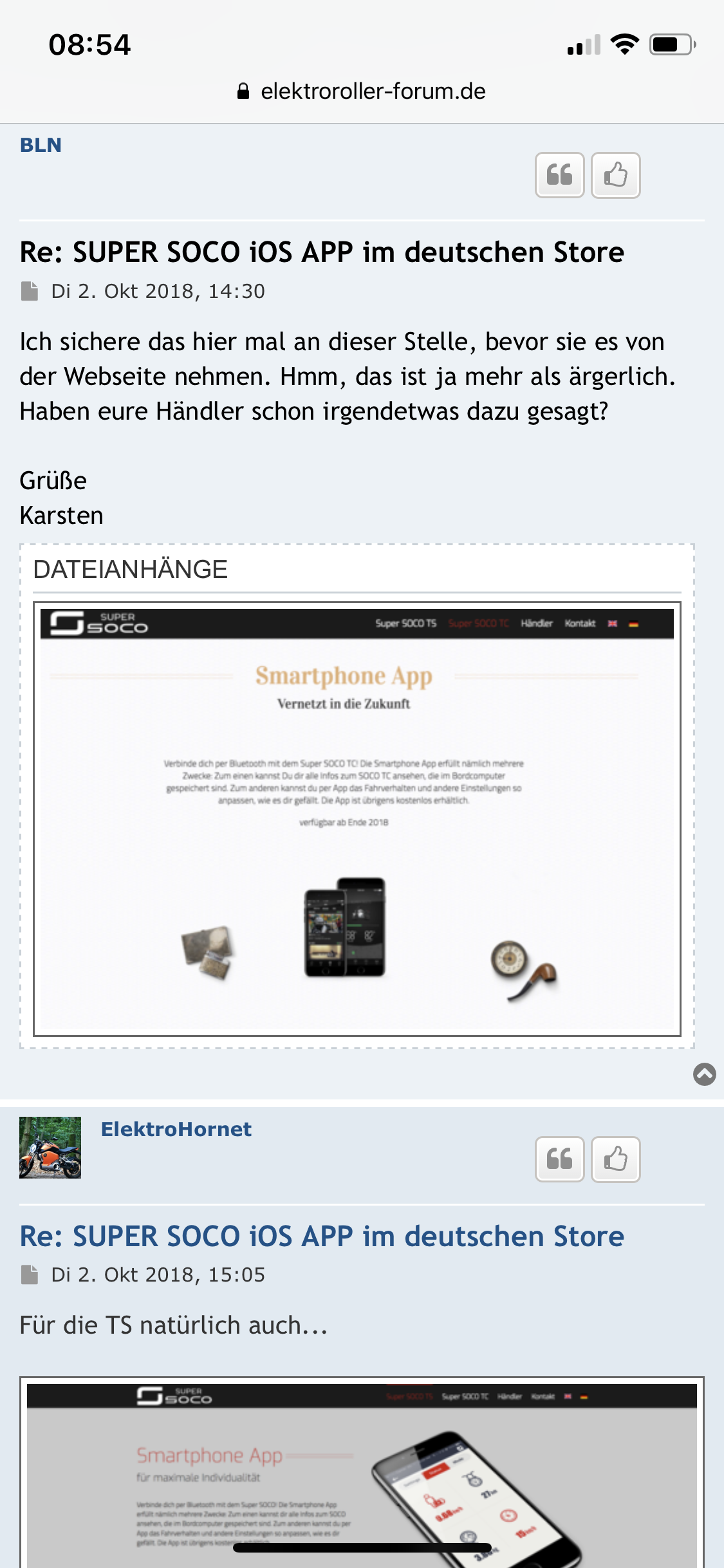 Als die App im Herbst 2018 zur Verfügung stand, stellten die Besitzer der Super Soco fest, dass die Verbindung trotzdem nicht möglich ist. Die Ursachenforschung ließ die Vermutung zu, dass das Hardware-Modul fehlen würde, und das OBWOHL in den Prospekten und auf der Webseite des Europa-Importeurs vor Oktober 2018 beworben wurde. Die Ausschnitte von damals hier aus dem Forum: