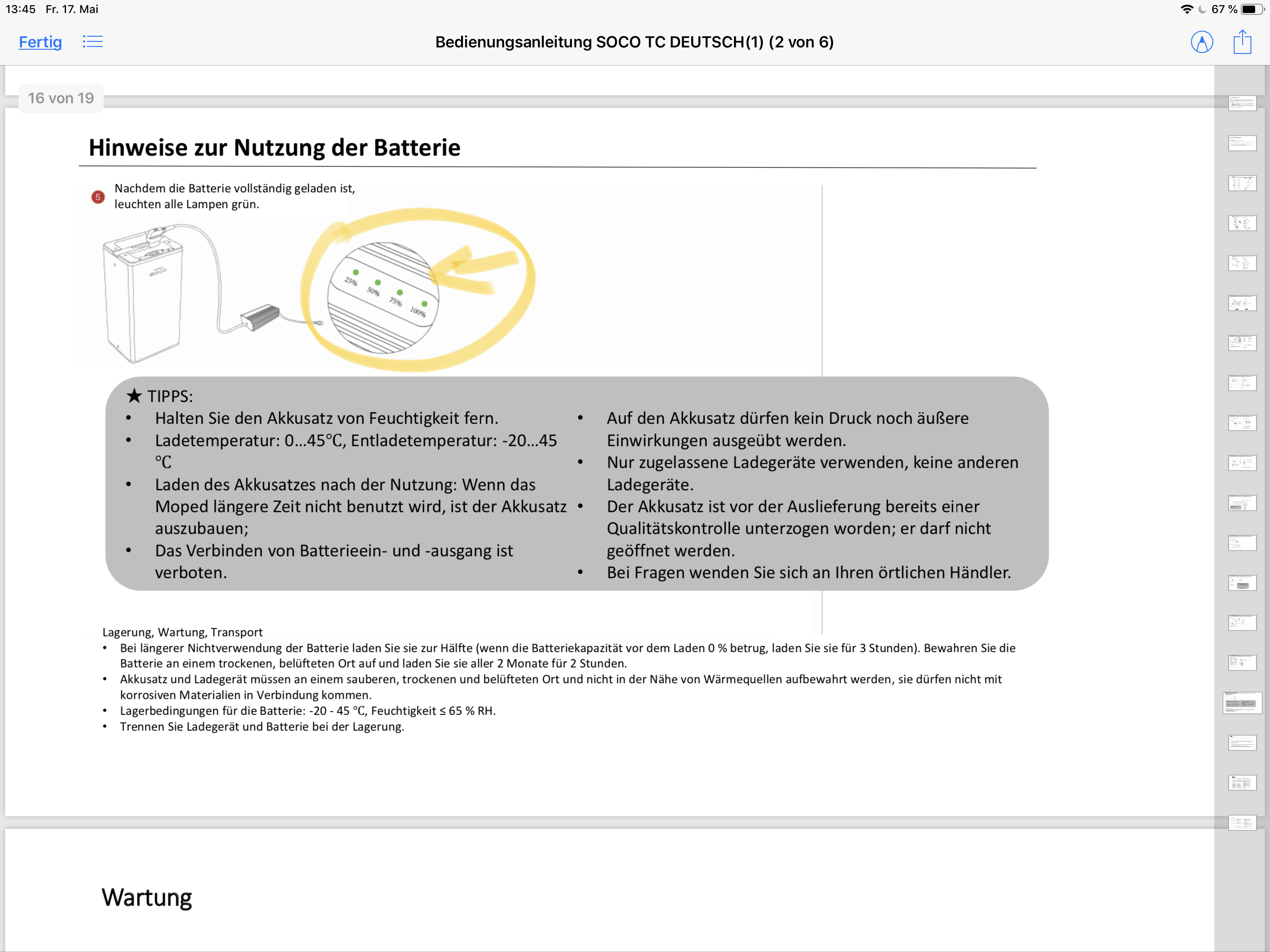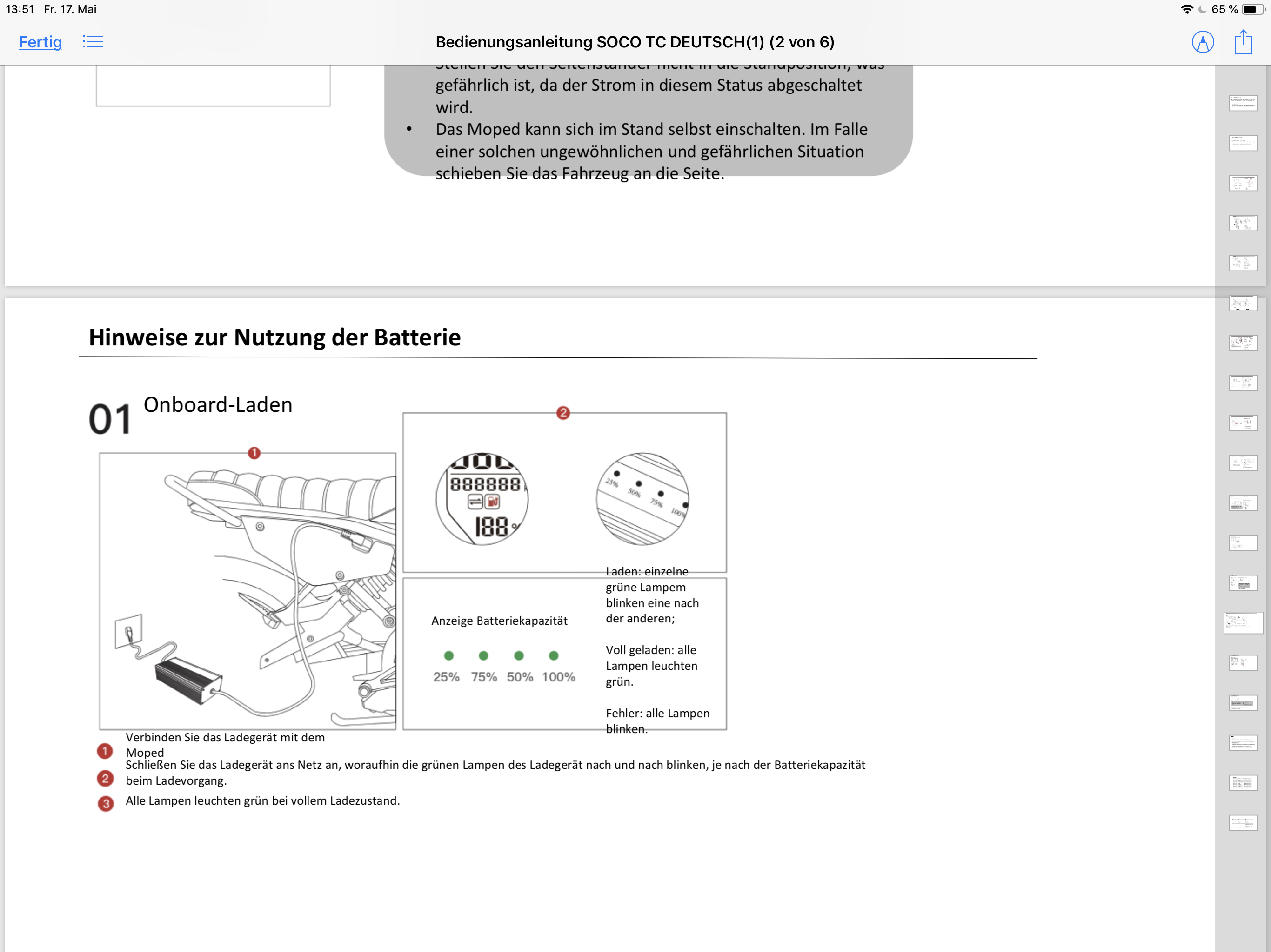 Direkt aus der Bedienungsanleitung vom Händler (per eMail als pdf zugestellt), man beachte die 25% Schritte bei der Ladezustandsanzeige - fehlt an dem Ladegerät, das im Lieferumfang war: