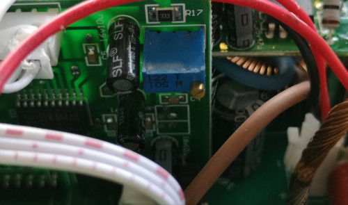 Am Poti hier im Bild, haben wir dann getestet ob sich etwas tut, wenn wir daran drehen. Wir konnten so die von gegen den Uhrzeigersinn von 71,4V auf 70,1V reduzieren.