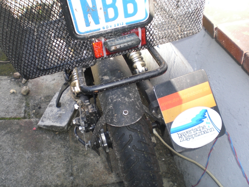 Den Rest des Vormittags habe ich dazu genutzt, endlich mal das Rücklicht höher zu setzen. Es ist jetzt am Korb unterhalb des Nummernschildes, aber oberhalb des zusätzlichen Reflektors, angebracht. So ist es besser vor Aufprällen unvorsichtiger Zweiradfahrer geschützt. Eine Verlängerung des stromführenden Kabels war nicht erforderlich.