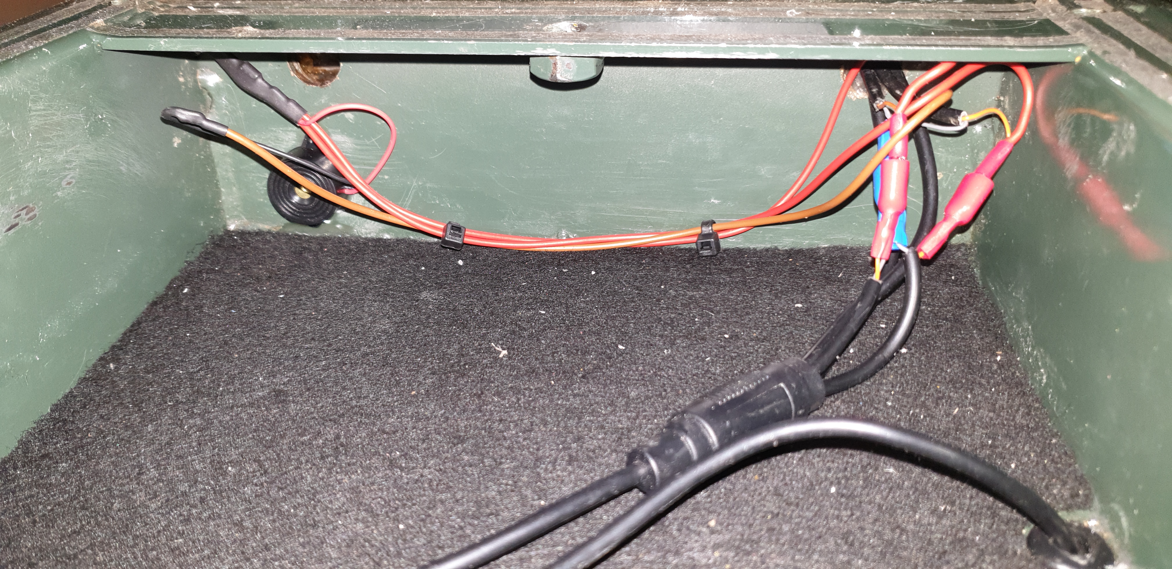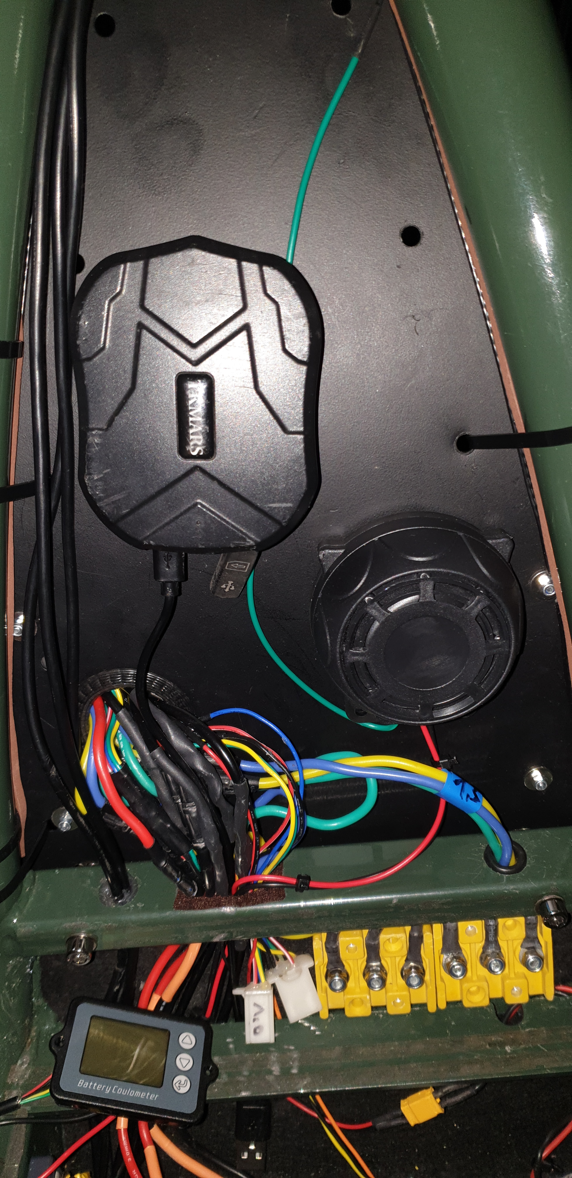 Der GPS-Tracker, Alarmanlage wurden vorseitig unter das Blech befestigt und bekommen über den zweiten XT-90 Ausgang und den 12 V Converter des Akkus permanent Strom. Der andere 12 V Converter dient den 2x USB-C Anschlüssen.
