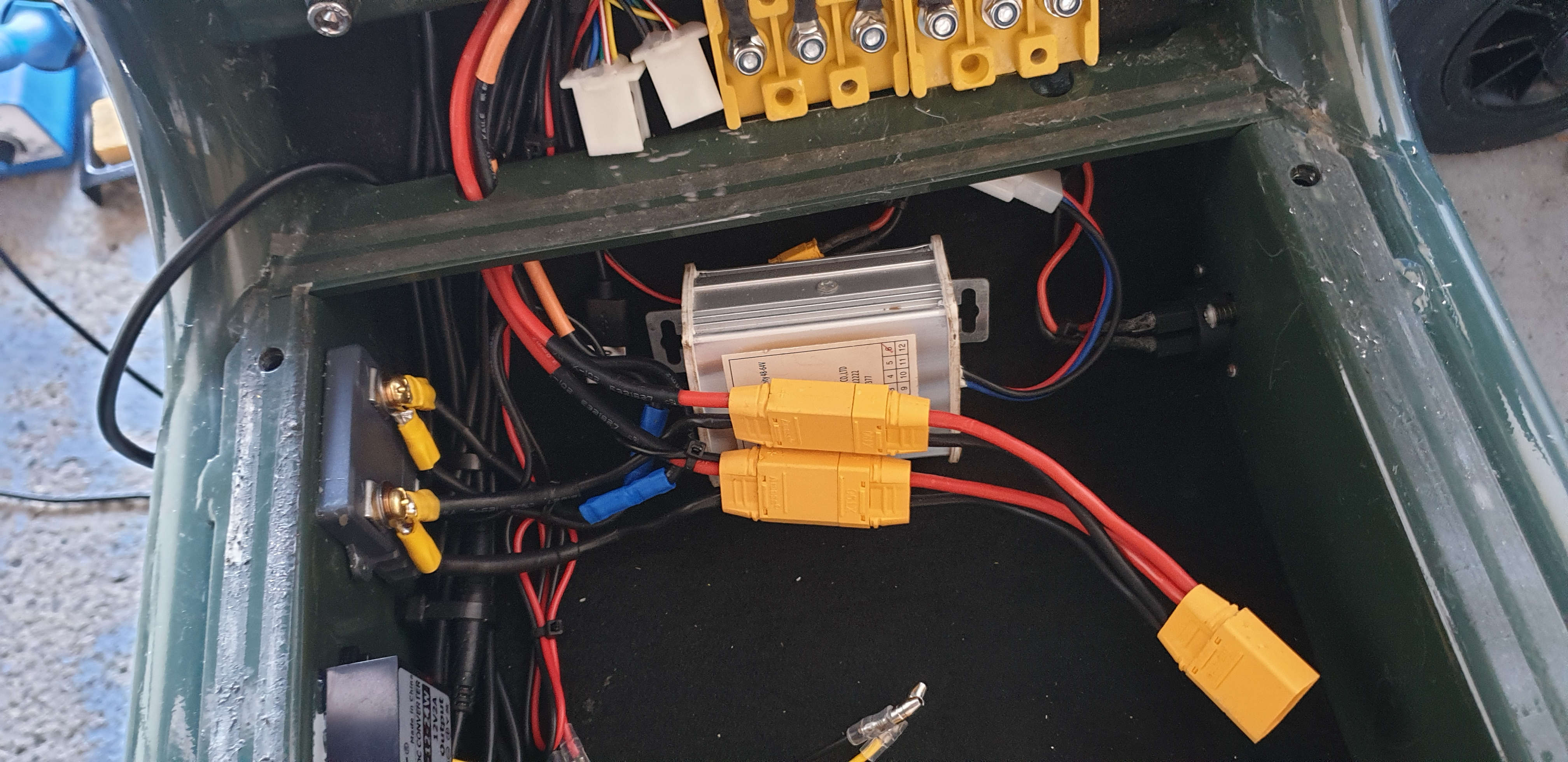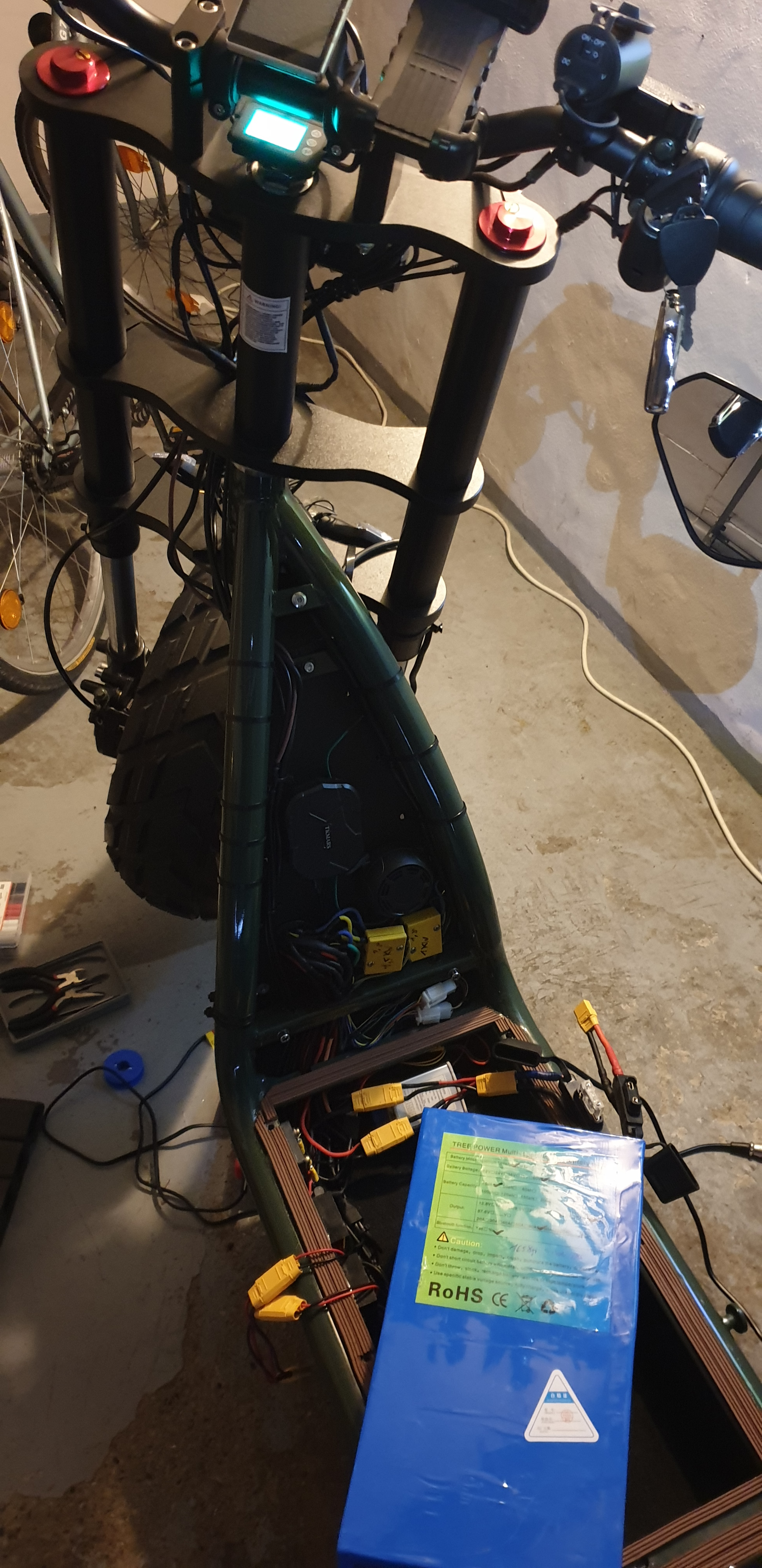 was hat mir das gebracht ? gar nichts. es ist folgendes passiert: ich konnte nicht mehr normal anfahren. der scooter ging sofort aus. ich musste durch akkutrennung neustarten. anfahren war nur noch ganz ganz langsam möglich bis ich so ca. 15-20 km/h erreicht hab. erst dann konnte ich von da ab vollgas geben. dann zog er zwar schweinisch an, die beschleunigung hatte schon was von einem motorrad aber das wars auch. dann ging es bis zur endgeschwindigkeit von 48 und das wars. mehr nicht. die 48 km/h hatte ich aber auch schon vor dem draht einlöten. ausser beschleunigung hat es gar nichts gebracht. vor allem kann man so nicht anfahren wenn sofort der controller abschaltet bzw. das BMS. den draht wieder raus und er reagierte wieder normal beim anfahren ohne abschalten.