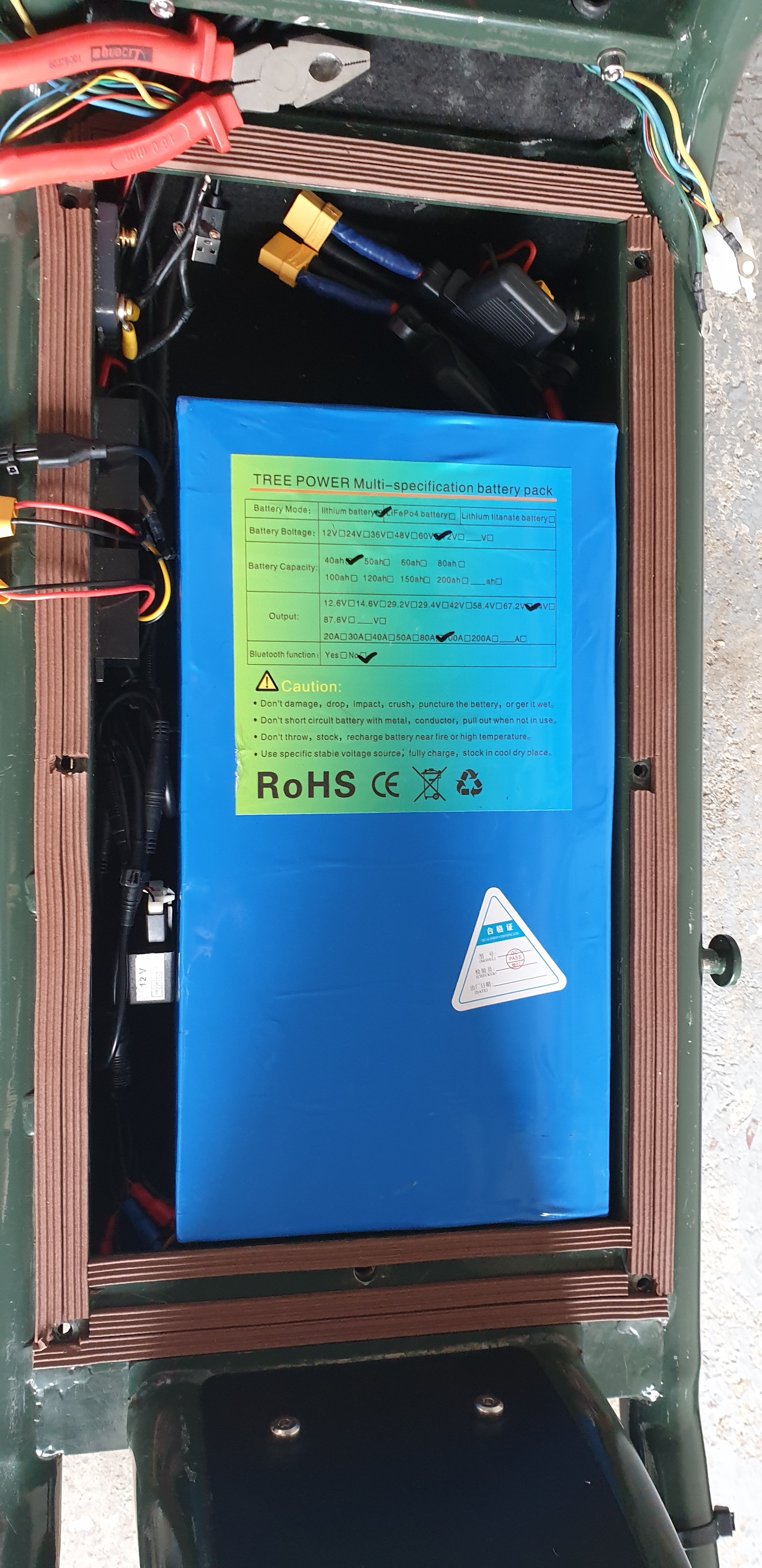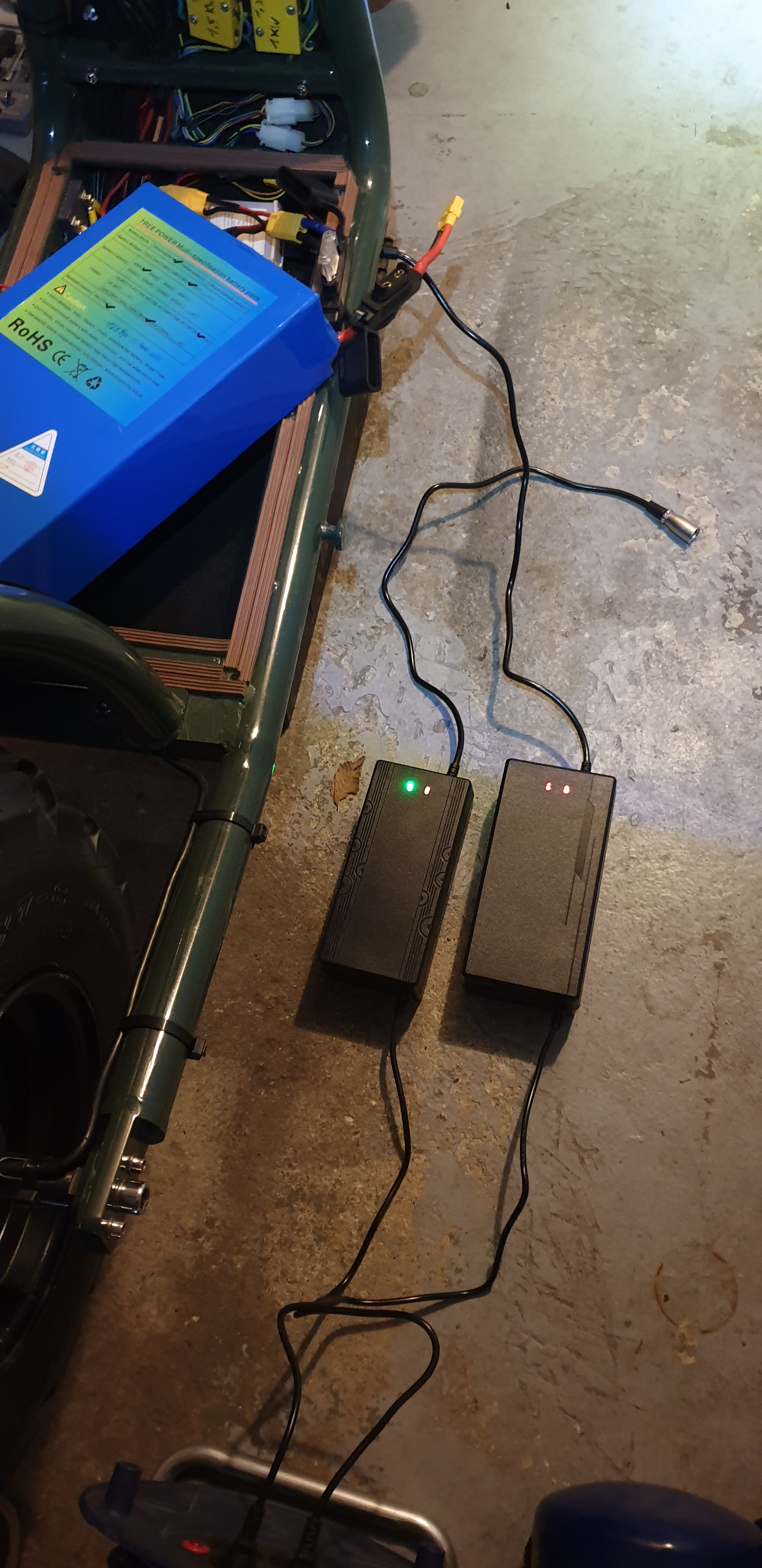 Nach ca. 8 Wochen hatte ich dann endlich meinen DIY Lithium-ION Akku mit 60V/40Ah/21700/16p8s/80A BMS Tesla Zellen und einen 5A und 10A Charger inkl. 3 Jahre Garantie erhalten. Dieser lädt auf max. 66.6Volt mit dem 5A Charger innerhalb von 7-8 Std. bzw. dem 10A Charger innerhalb von 4 Stunden. Da nun bekannt ist, dass ein Akku IMMER langsaammm geladen werden sollte, hatte ich bislang den 10A nur testweise verwendet. Funtkioniert einwandfrei!