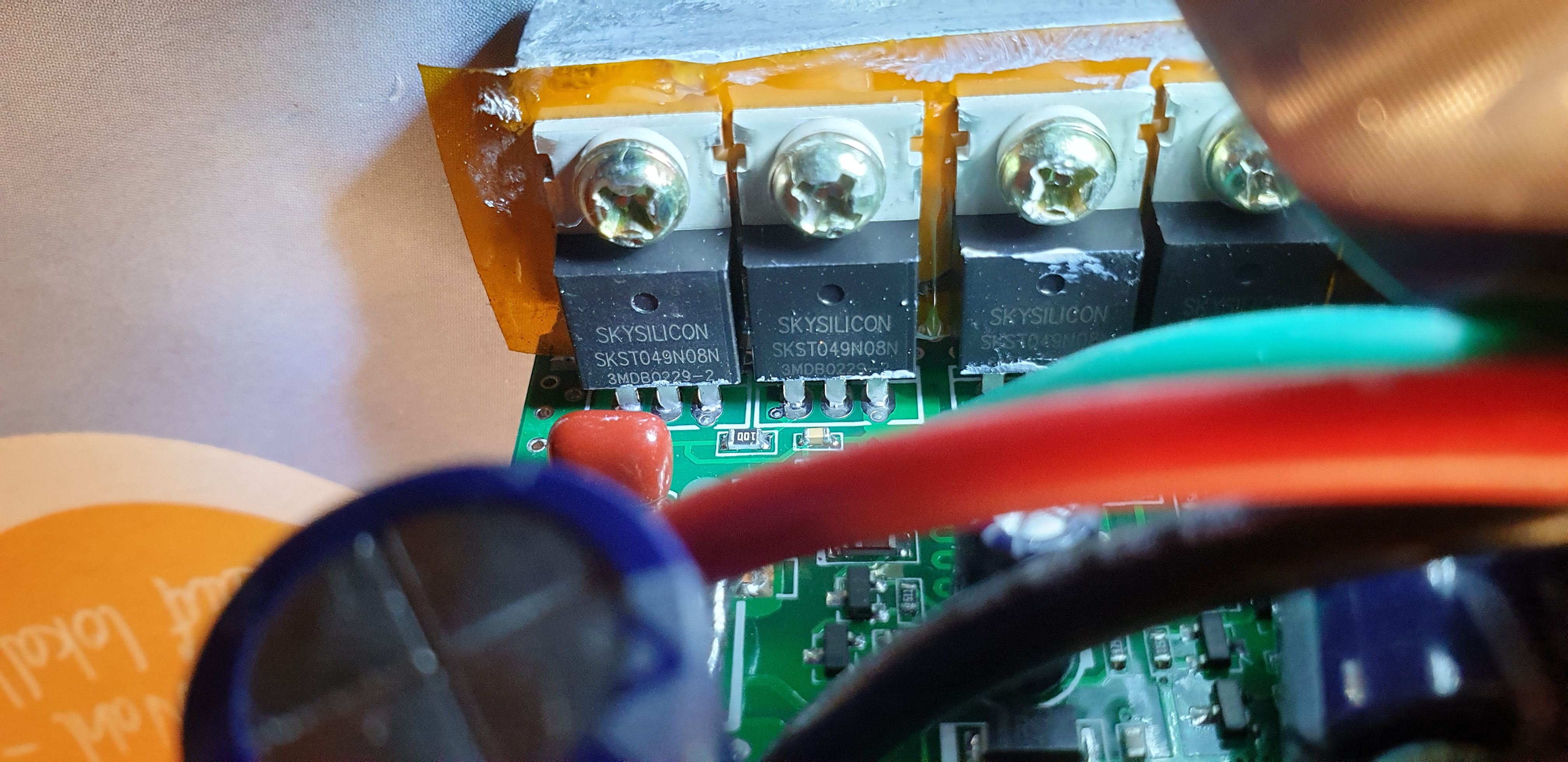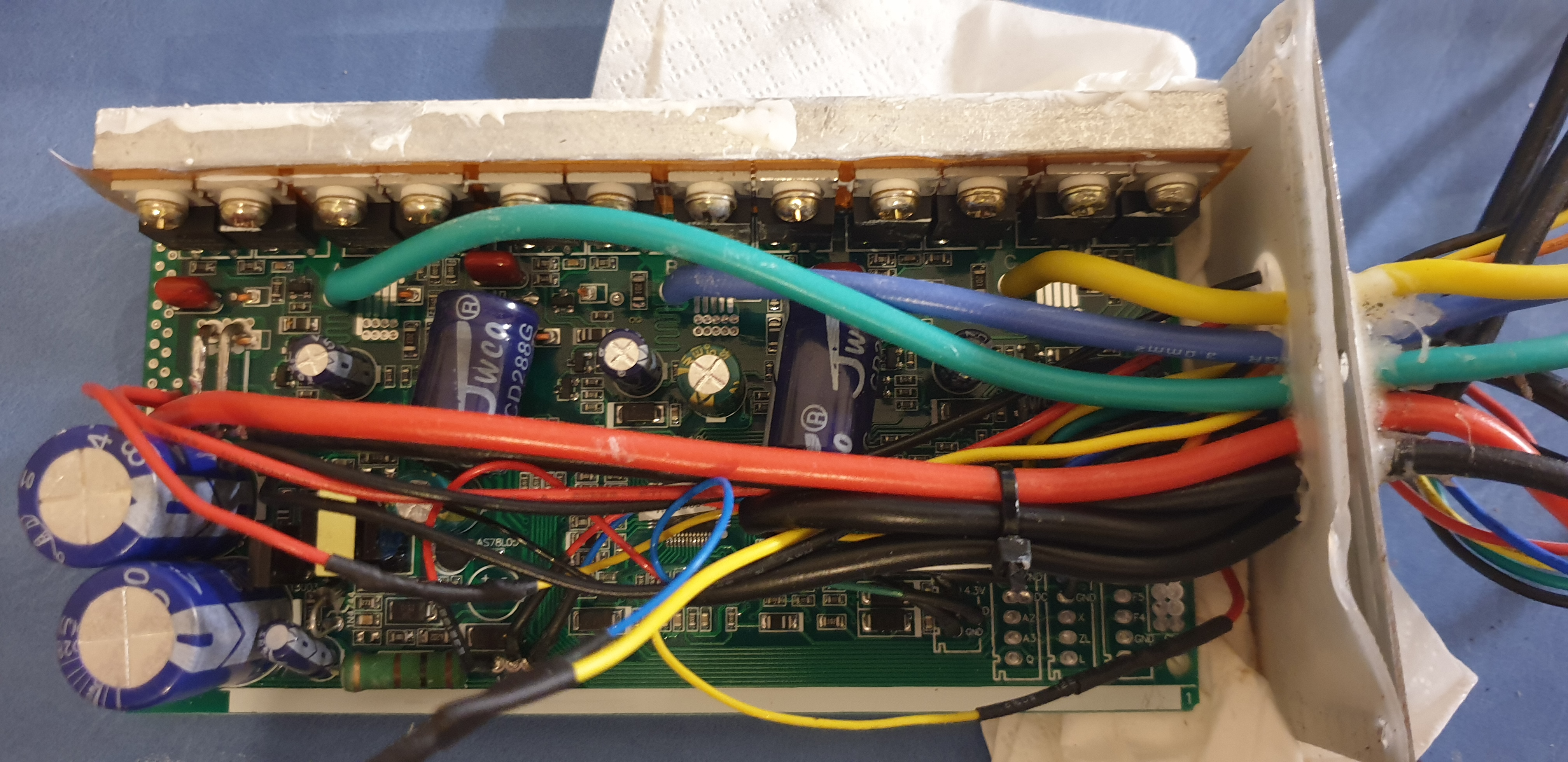 übrigens, wenn ich das auf dem bild richtig sehe ist dein controller genauso aufgebaut wie meiner. dann müssten es 5 kondensatoren sein die getauscht werden müssten. die beiden großen neben dem shunt, dann die beiden mittelgroßen die auf dem board aufliegen und der eine, ein kleinerer der vorne an der platte unter dem gelben kabel steht. das sind genau die die mir weggeflogen sind bei meiner übertromung. die haben die 67 volt nicht verkraftet. die sind nur bis 63 volt ausgelegt bei mir. die anderen auf dem board sind nur für niedervoltspanung für die schaltkreise bzw. regelkreise da. weswegen die auch deutlich mit der spannung unter der des akkus sind. du brauchst eigentlich nur auf die kondensatoren schauen und dann erkennst schnell welche es sind. haben die eine deutlich kleinere spannung als die vom akku gehören die zu den schaltkreisen und nicht für den hochspannungsbereich des motors und der leistung.