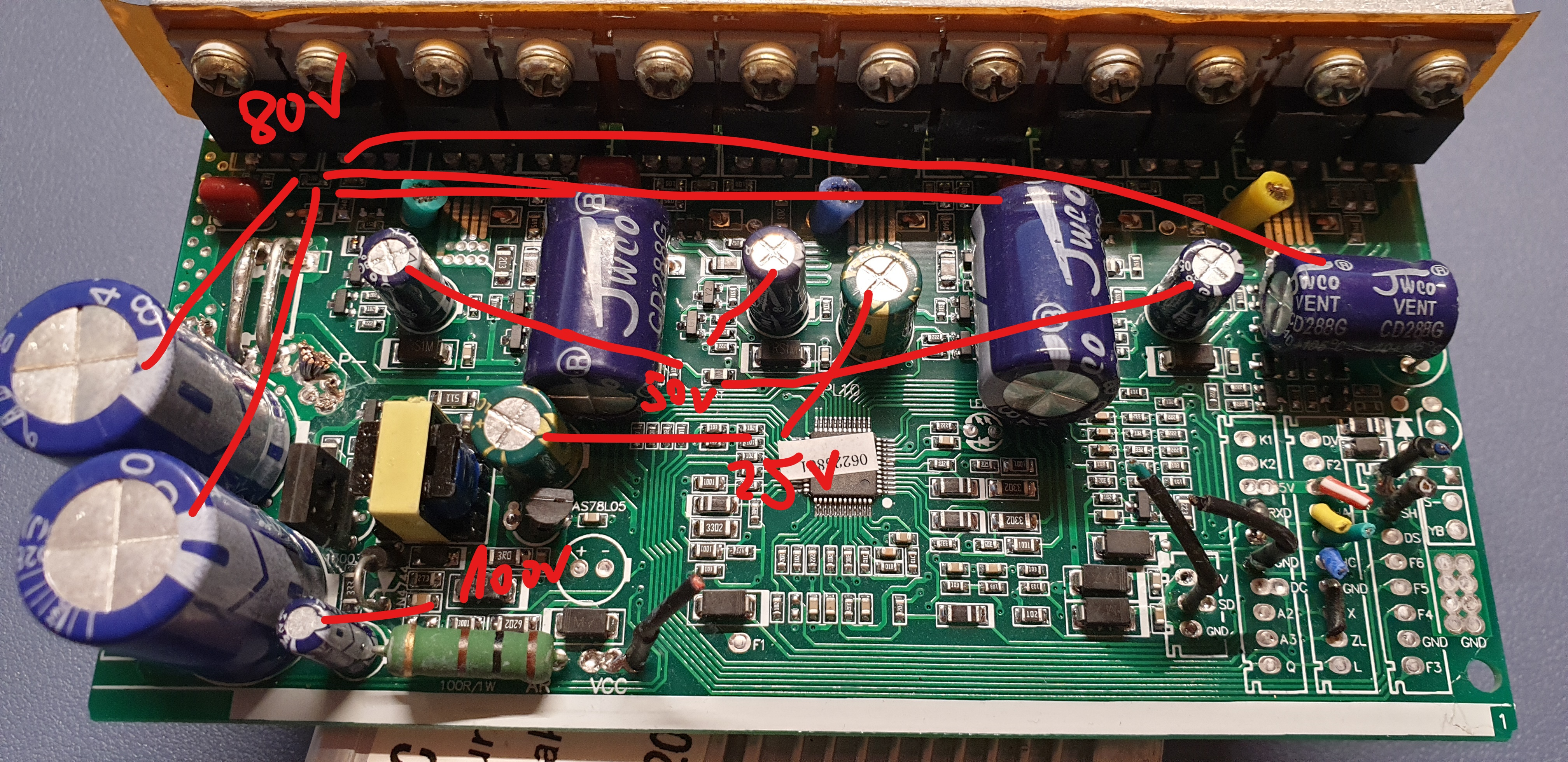 Dann habe ich 6 weitere, davon die beiden dicken Eingangskondensatoren mit je 80V, 3 liegende mit je 80V und noch so ein winzig Kleinen neben den beiden Dicken mit 100V