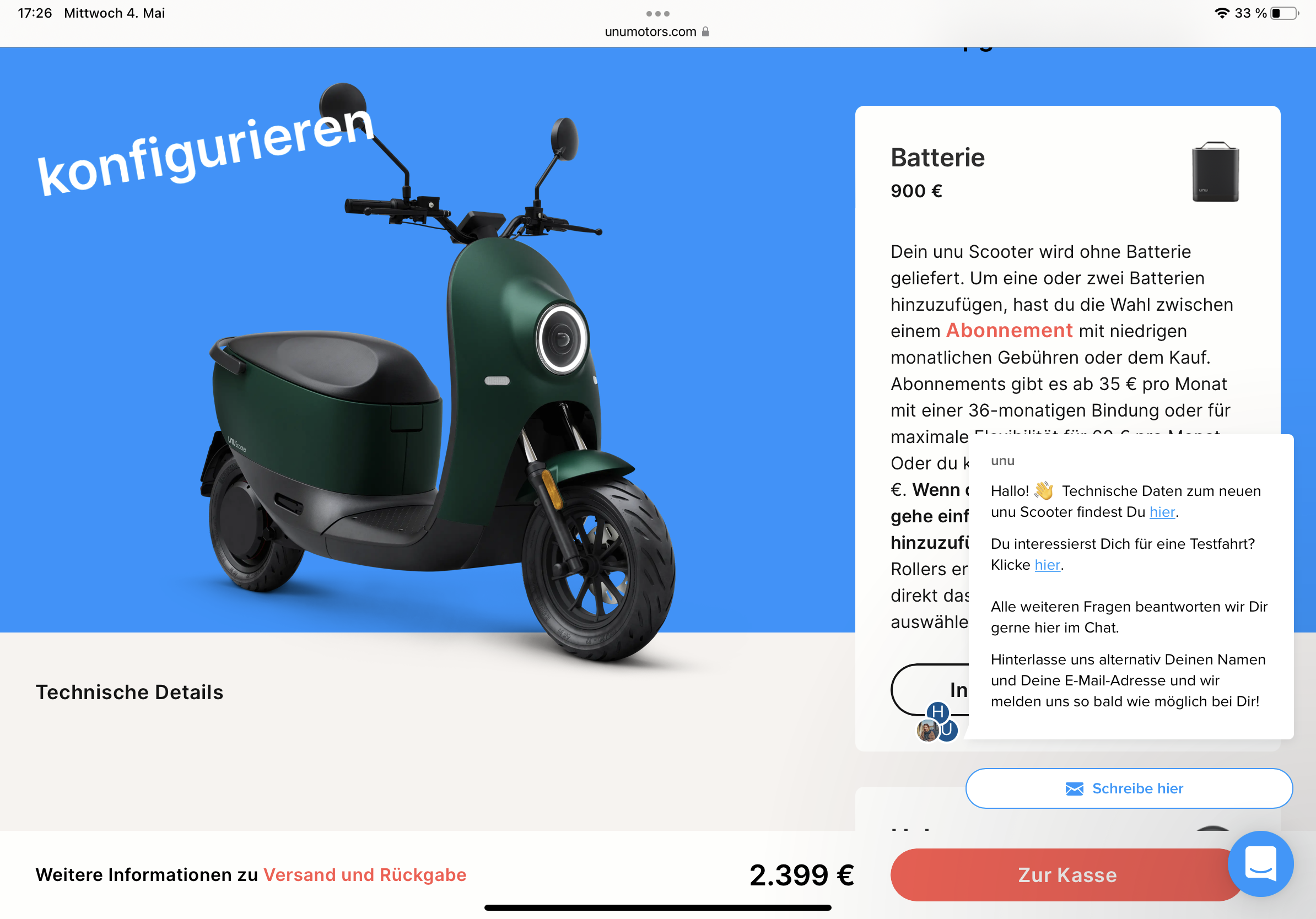 Es gibt Neuigkeiten UNU scheint wirklich mir zu lesen habe grad eine Mail von UNU bekommen: Da wir aber ebenfalls sehr viele positive Rückmeldungen zu der neuen Abonnementoption bekommen haben und zu 100% von unserem Batterie-Abo-Programm überzeugt sind, reduzieren wir den Preis für unser 36-Monats-Abo-Tarif von 35 € auf 25 € pro Monat je Batterie! also ich muss sagen UNU scheint echt wert auf die Meinungen in Forum zu legen