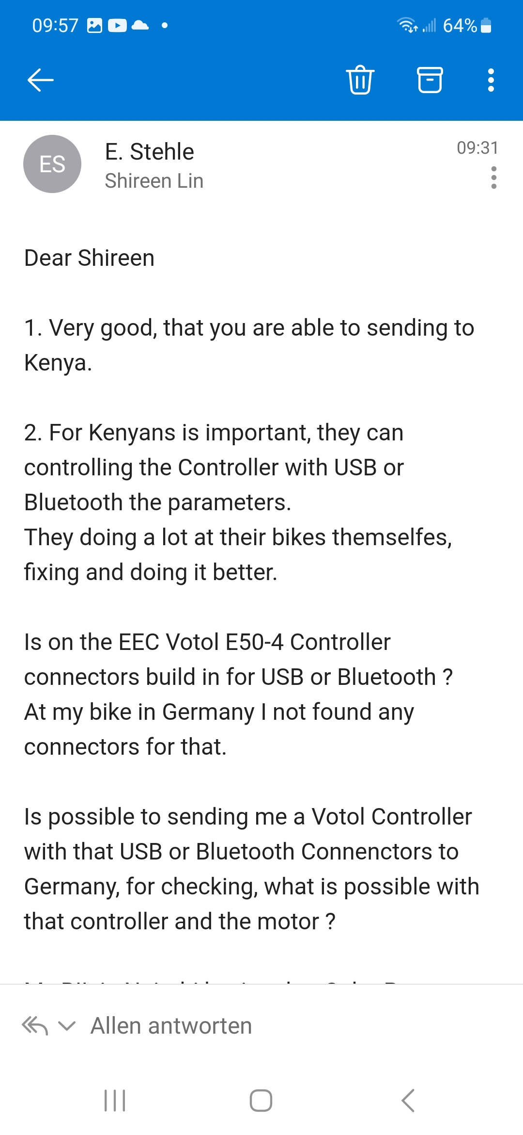Mein Schwager, der Kenyaner ist, hat in Nairobi eine Firma, und Yuhanzhen ist bereit, einen Controller nach Nairobi zu liefern, meines Modells, mit aufgespielten Parametern und mit USB und Bluetooth Schnittstelle