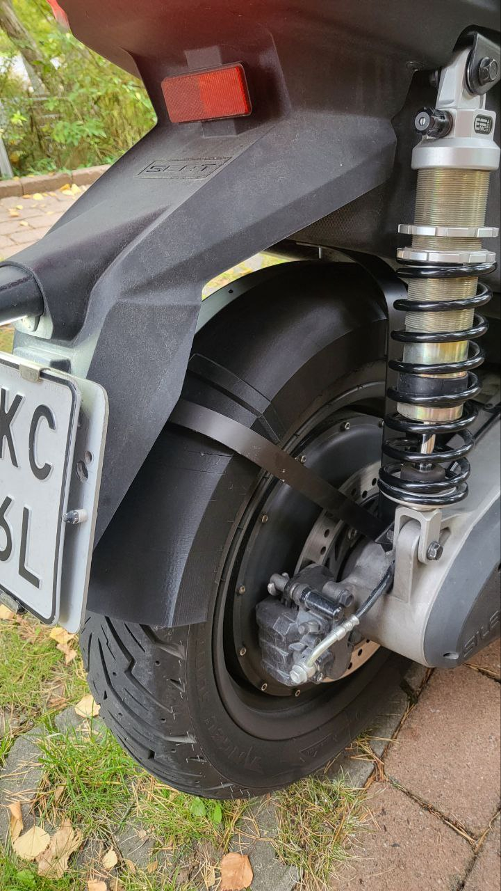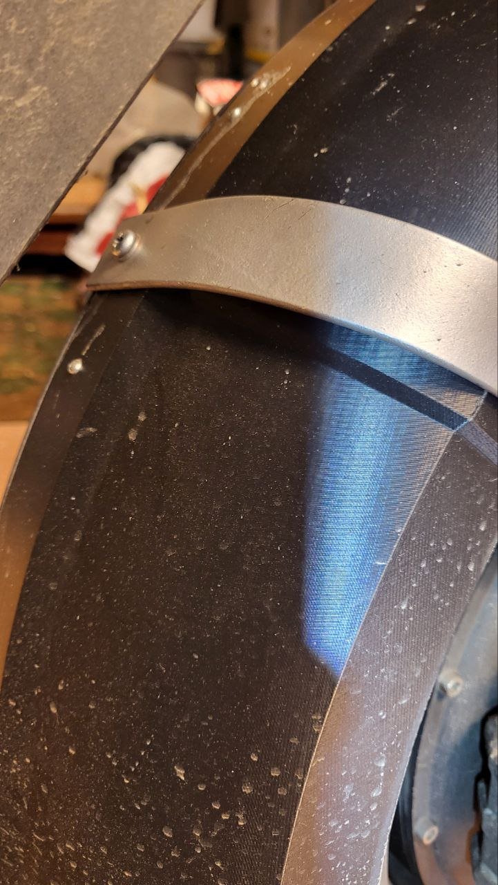Ich habe in Zusammenarbeit mit @m···@wrmueller.de , der für die Konstruktion steht, einen in Segmente aufgeteilten Spritzschutz ausgedruckt, diese zusammengefügt und hier sieht man das Ergebnis. Rechts im Bild ist der "vordere" Spritzschutz zu sehen den @WRmueller bereits früher konstruiert hat und der bei einigen offenbar erfolgreich im Einsatz ist. Den Alu-Flachstab zut Versteifung habe ich mit Blindnieten angenietet.