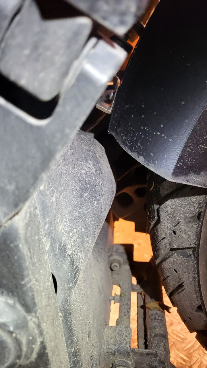 Hier und heute aber: Jawohl, es geht! @wrmueller hat ja, wie schon früher berichtet, einen zusammensteckbaren Spritzschutz konstruiert und ich hatte denselbigen hier ausgedruckt. Die Befestigungsvariante vom September mit den 2 Flachstahleisen, manuell angepasst/gebogen, war mir auf Dauer nicht stabil genug. Bei extremen Schlaglöchern (hier in Schweden zum Glück selten) federte die Mó voll ein und dann kam das Konstrukt an seine haltungstechnischen Grenzen.