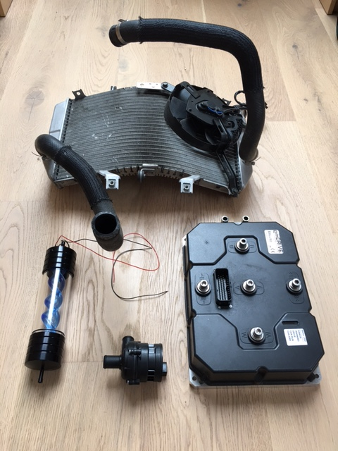 Bin ja auch für den vR one am Überlegen, wie man dem Controller eine gescheite Wasserkühlung angedeihen lassen könnte. Kühler gibt es ja von Verbrenner-Rollern und -Moppeds, aber die elektrische Kühlwasserpumpe dürfte doch ein eher seltener Geselle sein für Mopped-taugliche Durchsätze? Oder was hast Du da (bald wieder) im Einsatz? Ist das die komische Schraube im Glasrohr mit den zwei Kabeln dran?