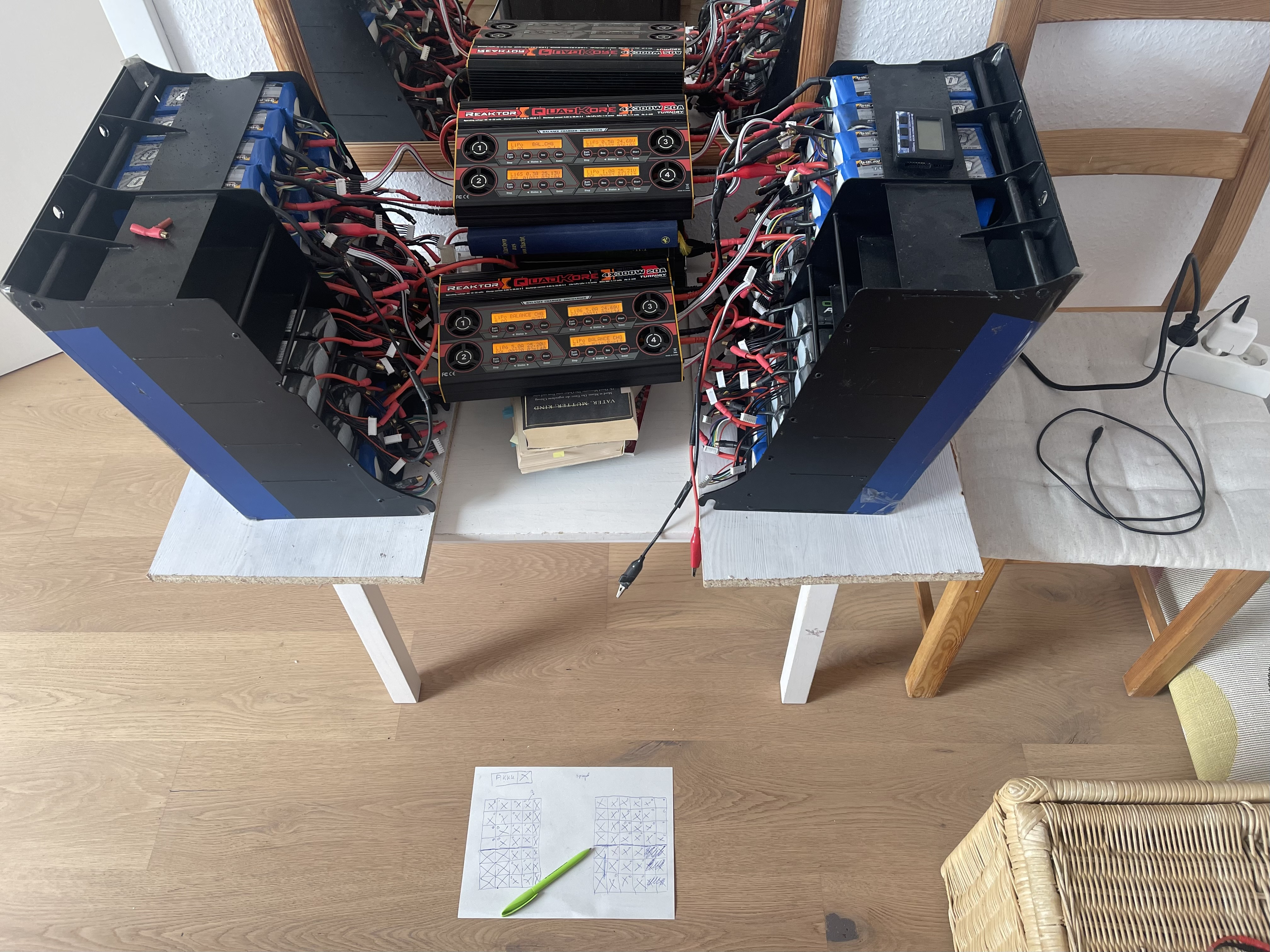 Könnte höchsten die Akkus soweit wie möglich nach hinten schieben, also erste Reihe vorne frei lassen und nochmal um 25V erhöhen. Dann wären es 30 Akkus pro Seite (750V GC).