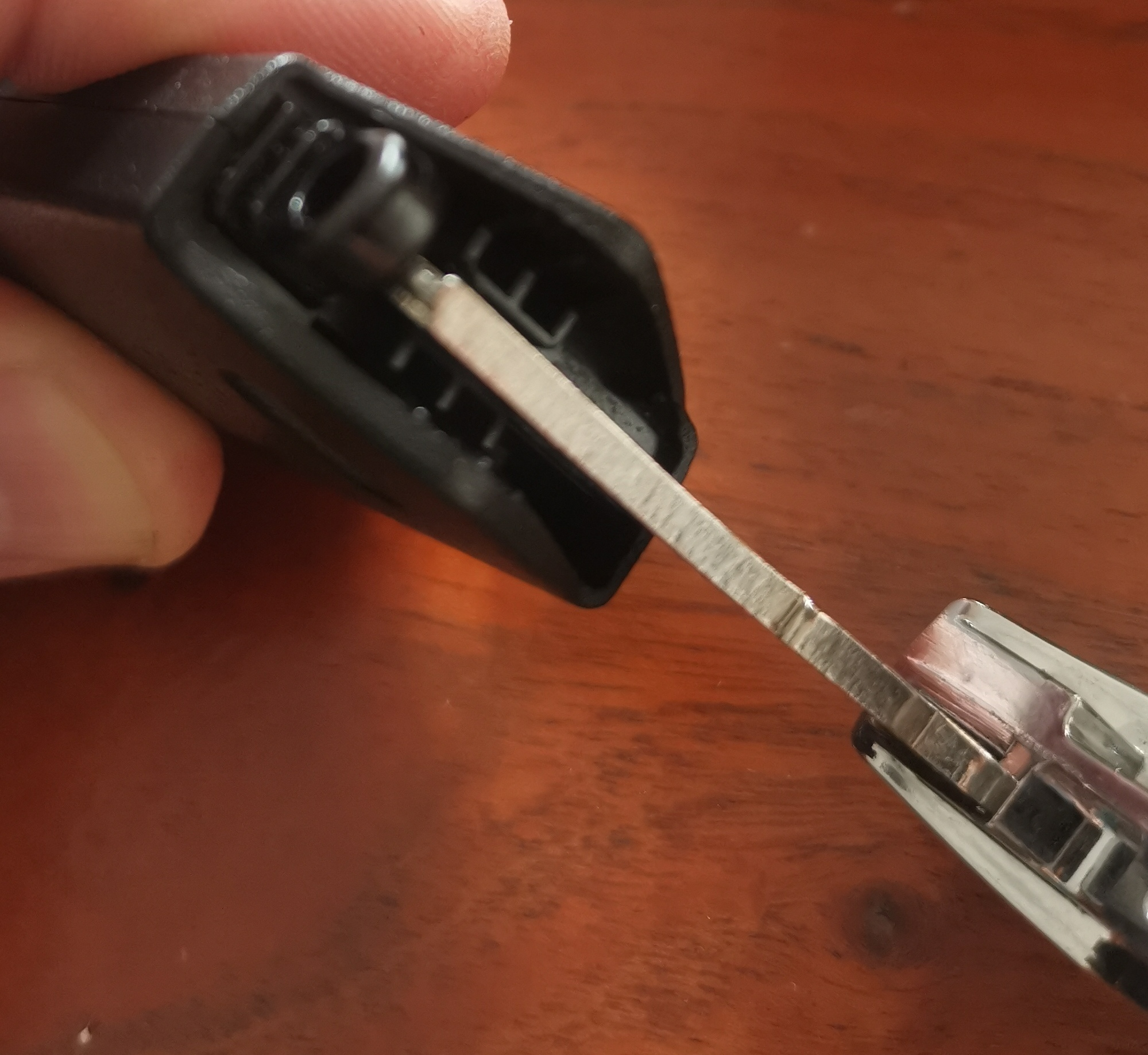 Du musst den Schlüssel aus dem Gehäuse ziehen und in oben wie auf dem Foto als Hebel ansetzen um das Gehäuse auseinander zu drücken. Ähnlich wie bei VW oder Mercedes. Dann siehst du die Innereien vor dir.