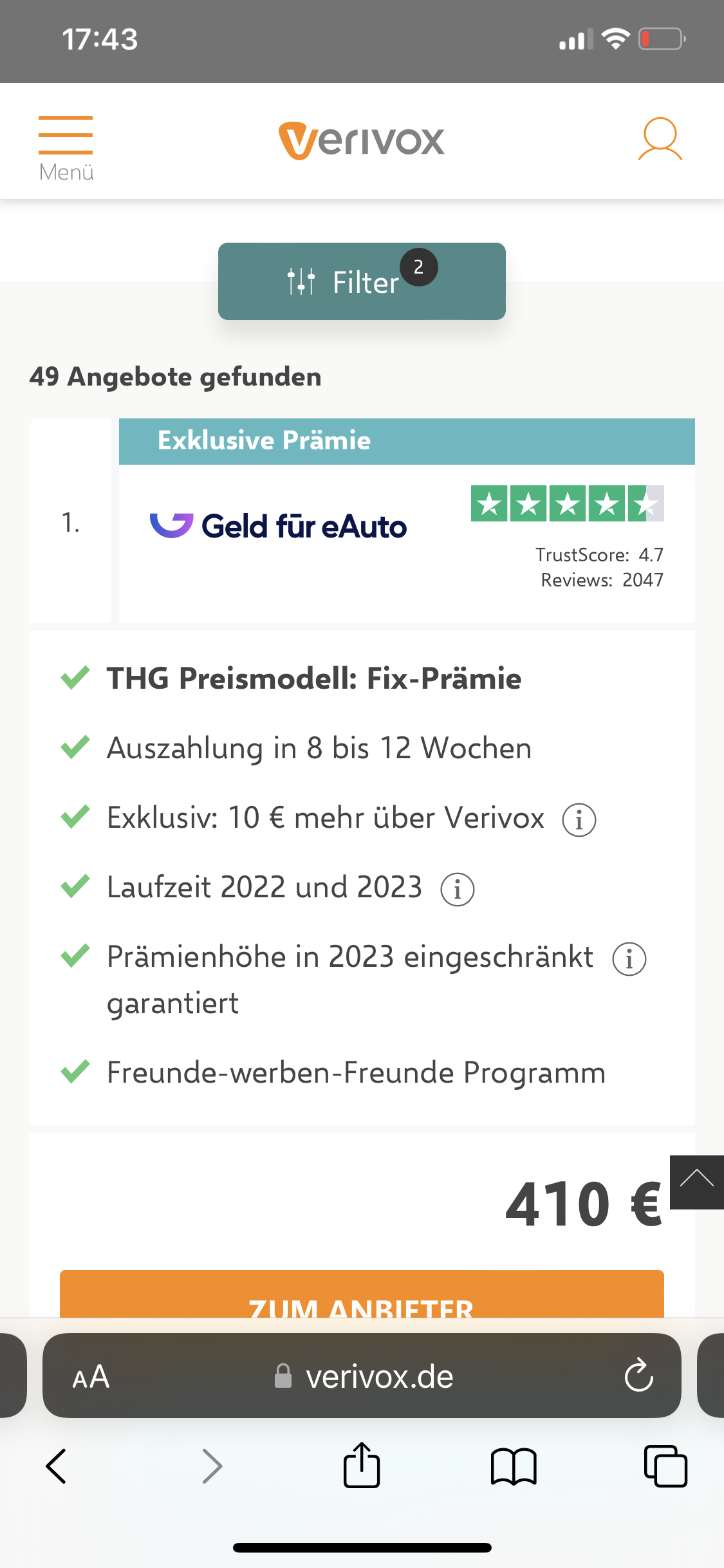 Achtung bei geld für eauto: Du schließt da ein zwei Jahres Vertrag ab. Im zweiten Jahr ist nichts garantiert. Du solltest unbedingt nach der Anmeldung die Lautzeit auf 2022 begrenzen.