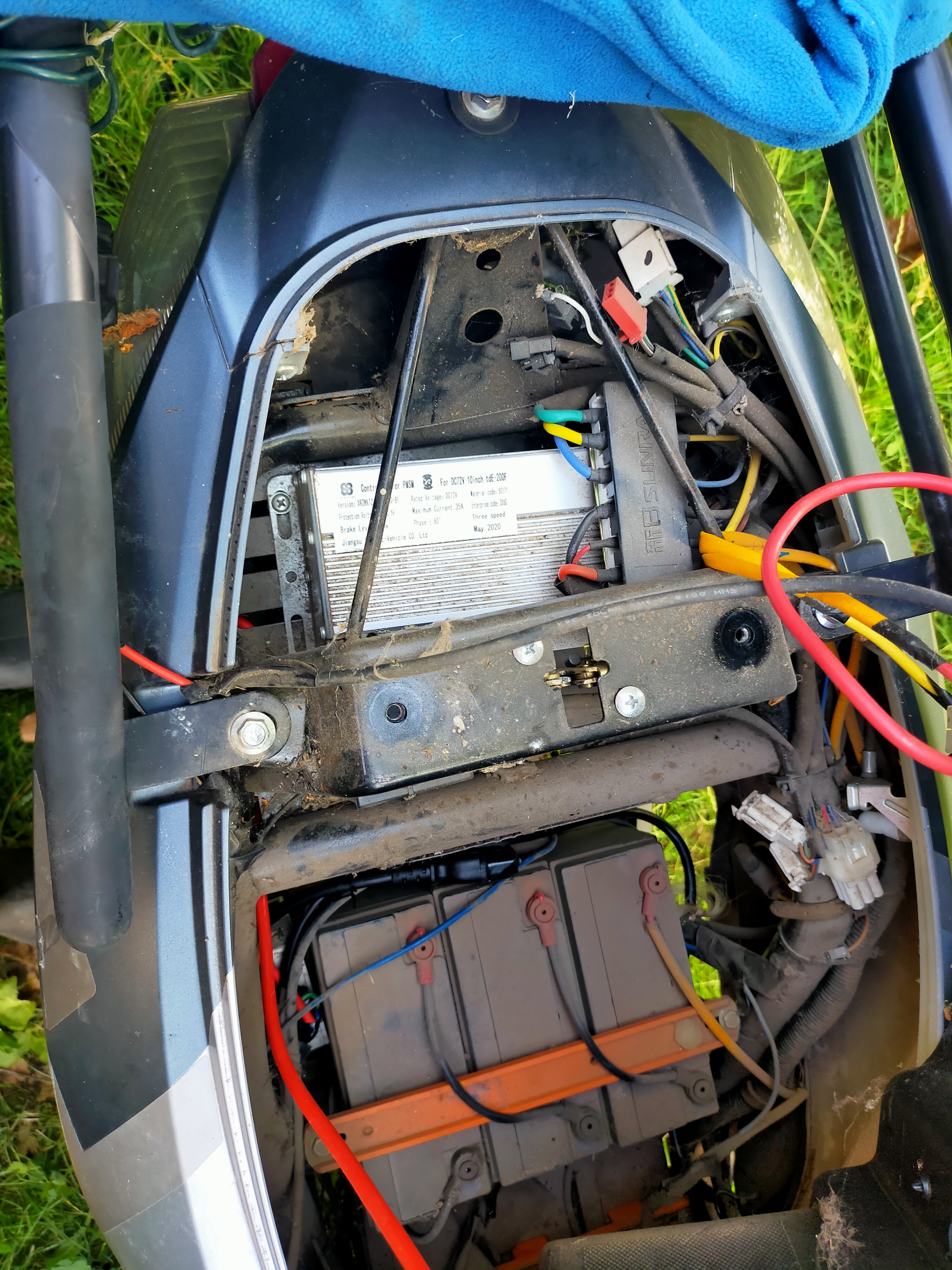 Mein Leo Elektroroller 72 V 62 Ah etwa 2 1/2 Jahre alt, 4642 km (Rollerkilometerzähler) gefahren. Ich habe bisher diesen Roller immer geschont, um erst meinen anderen Leo zu Ende zu fahren mit dem ich etwa 20000 km in 4 1/2 Jahren fuhr. Bilder zeigen das Innenleben mit dem controler des 72V 20 Ah Leo, den ich seit Neukauf mittels 6 Stück 42 Ah 12 V Bleigel Akku aufgerüstet hatte zu 62 Ah 72 V.
