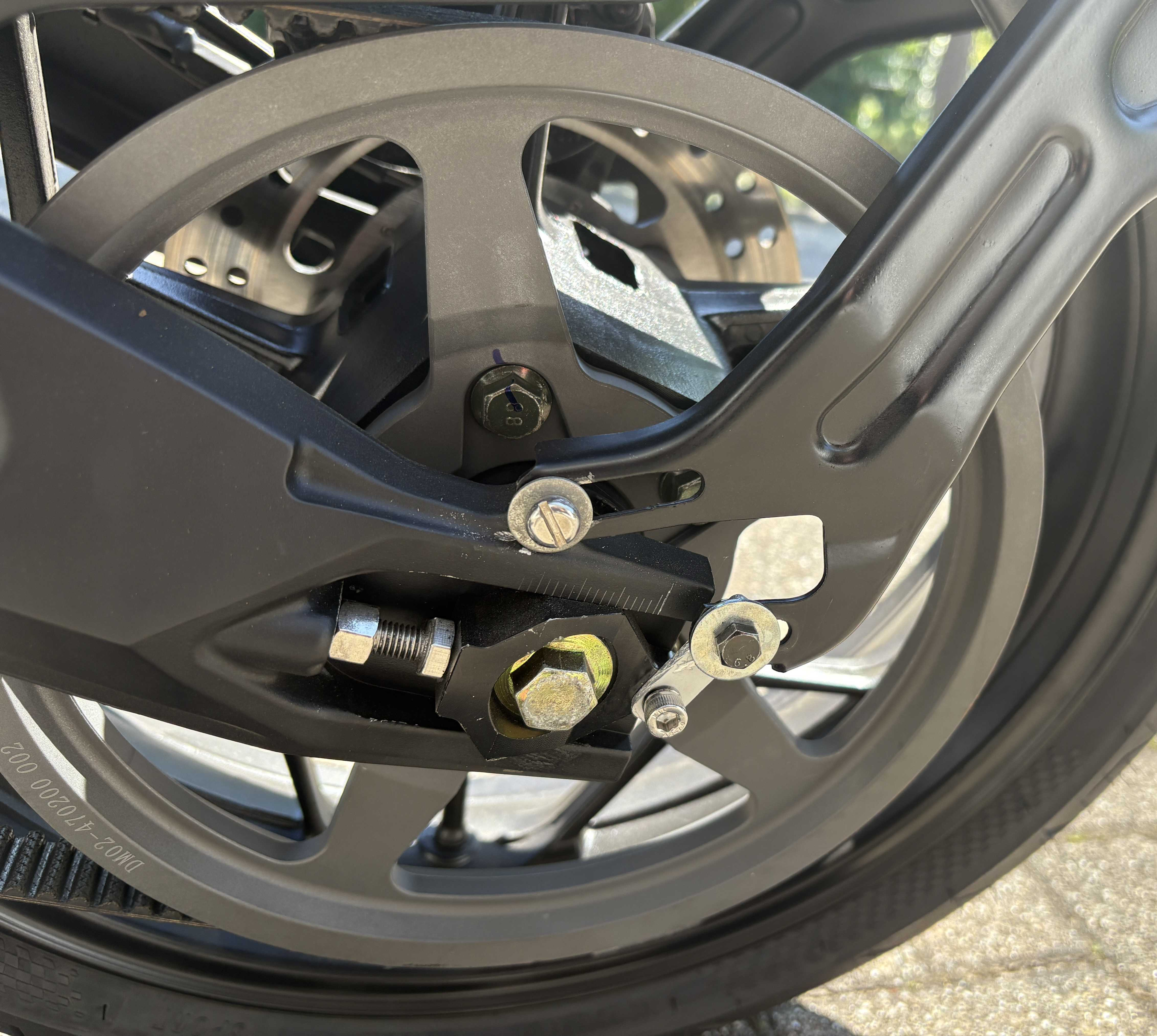 Allerdings: Die Tatsache, dass die Befestigung des relativ langen Auslegers ob mit oder ohne Anhebung dürftig ist, wird damit nicht korrigiert. Es empfiehlt sich daher, die Schrauben sehr gut festzuziehen und – soweit möglich wegen diverser Absätze im Schwingenprofil – mit Kontermuttern zu versehen. Außerdem sollte man auf eine (zu schwere) Metallplatte unter dem Nummernschild verzichten, das macht die Konstruktion nicht mit. Und eine regelmäßige Kontrolle, ob alle Schrauben festsitzen, ist angebracht.