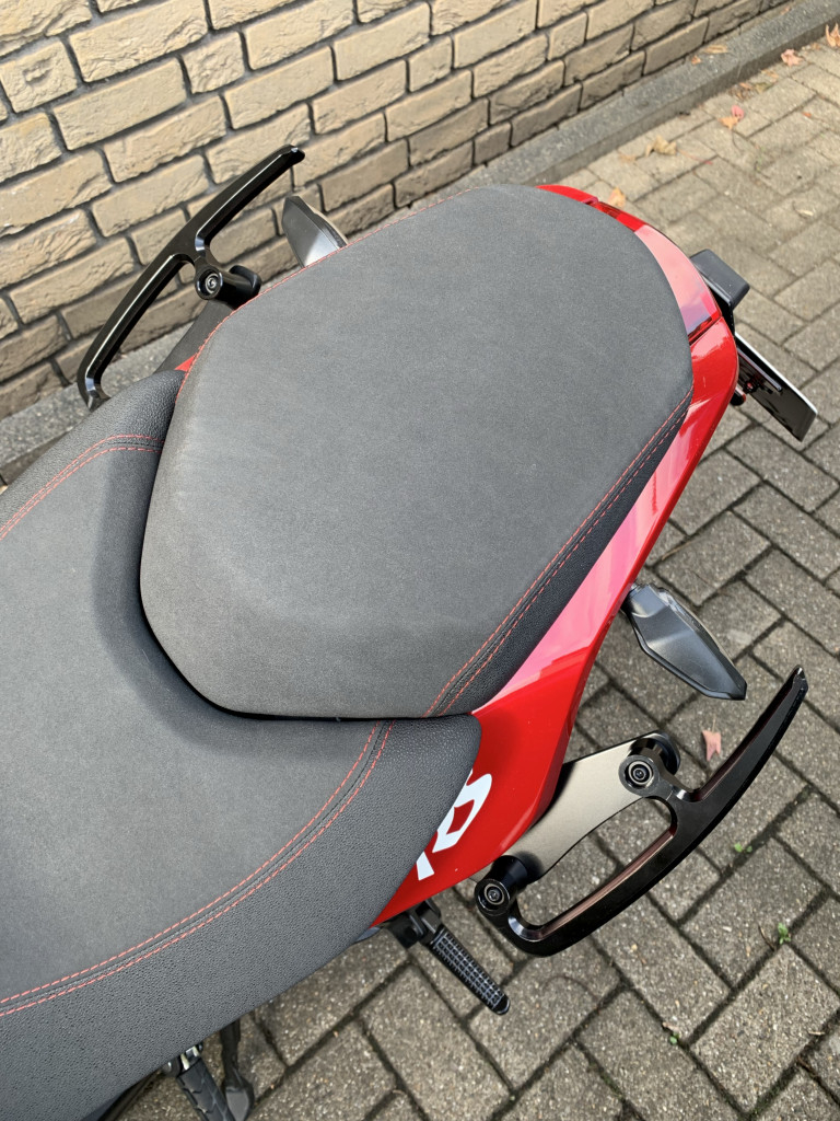 Meine gelegentliche Beifahrerin beklagt die recht weit vorne und tiefliegenden Griffmulden an der RS1. Sie ist es seit Jahren gewohnt, sich mit einer Hand an mir festzuhalten und mit der anderen an einem Griff. Irgendwie klappt das mit den Griffmulden nur bei merkwürdiger Körperhaltung. Vielleicht sind ihre Arme aber auch nur zu kurz für die Tinbot.