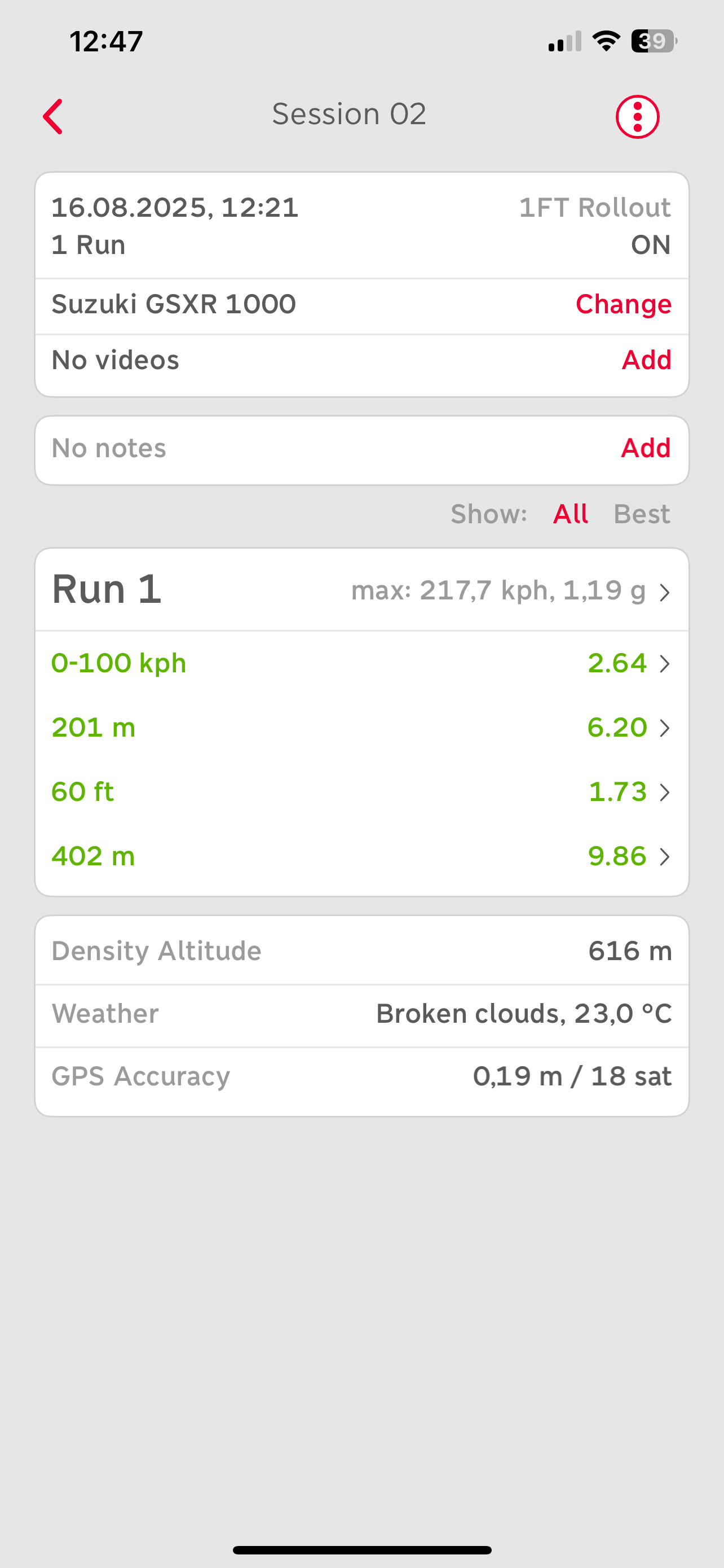 Hatte bei meinem besten Lauf allerdings mal wieder eine Reglerabschaltung direkt nach der 1/8 Meile und bin trotzdem noch in den hohen 9 Sekunden gelandet.