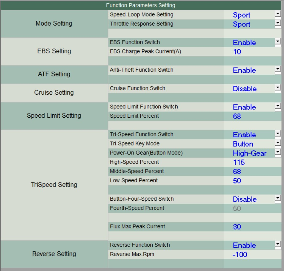 @nevio: Ich hab eigentlich die gleiche Erfahrung gemacht. Wenn man das Speedlimit auf disable stellt kann man die Prozent auch nicht mehr einstellen, erst Prozent auf 100 % und dann disable aktivieren bringt auch nichts. RPM erhöhen hat auch nichts gebracht. An die Stromstärke habe mich noch nicht getraut. An meiner Kiste gibt es keinen Trispeed Schalter, deswegen haben die Veränderungen bei high gear evt. auch nichts gebracht. Hast du einen Trispeed Schalter?