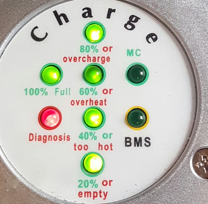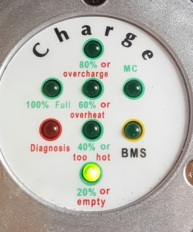 Wenn es noch ein älteres Ladegerät ist, die Batterie relativ leer und Die BMS Zentrale meldet keine Störung mit ihren zwei LEDs, dann, dann läuft nach dem Einstecken die LED-Reihe der Anzeige von unten nach oben durch (die grünen gehen alle kurz an), dann blinkt nur die unterste 20%, der Lüfter vom Ladegerät sollte starten, was dann sagt, dass es zu laden beginnt. Zu messen mit einem handelsüblichen Energimessgerät als Zwischensteckdose zwischen Netz und Ladegerät-Eingang. Anfangs zieht es vielleicht nur 150W, aber wenn es ernst wird fänt es mit ca. 900W an und arbeitet sich dann mit zunehmend steigender dauer-an Grüne-LED Reihe hoch bis knapp über 1000W kurz vor der Abschaltung bei zwischen 85 und 87V Gesamtspannung.