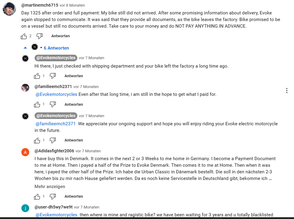 Nee, ich hatte es so verstanden, dass Helmut auch direkt in Dänemark bestellt hat. Es gibt ja keine deutsche Niederlassung (war auch für letzten Herbst versprochen...) und m.W. auch keinen deutschen Händler. Hab gerade keine Muße, den Thread durchzuschauen, aber ich meine mich zu erinnern dass Helmut 50% angezahlt hatte. Ist halt echt eine Frechheit, wenn sie einen vom Pferd erzählen (Schiff angekommen, 2-3 Wochen Wartezeit bis was kommt).... und ich denke auch eher nicht, dass dann jemand nach 1400 Tagen sein Bike bekommen hat. Das wird Teil des Scams sein.Stivikivi hat geschrieben: Mo 18. Mär 2024, 18:35 Lasst uns für den Helmut beten.