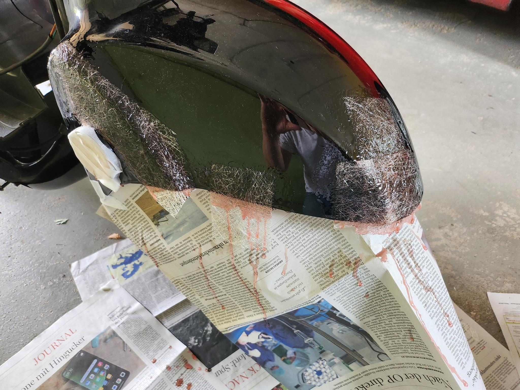Mir war die Sucherei nach der passenden Frontverkleidung dann zu doof, also für 19.99 ein Set 1kg Polyesterharz + Glasfasermatte bestellt und los ging die lustige Bastelstunde. Zuerst mit bereits vorhandenem Sekundenkleber die Teile aneinandergeklebt, dann von innen mit Polyesterharz bestreichen, Matte drauf und nochmal bestreichen. Insgesamt war das mit Vorbereitung wohl so 5-6h Arbeit, verteilt auf 2 Wochenenden. Ich musste auch bestimmt 5-7mal Polyesterharz anrühren, weil das Verstärken aller Halterungen ziemlich fummelig war und das immer nur 2-5 Minuten flüssig bleibt.